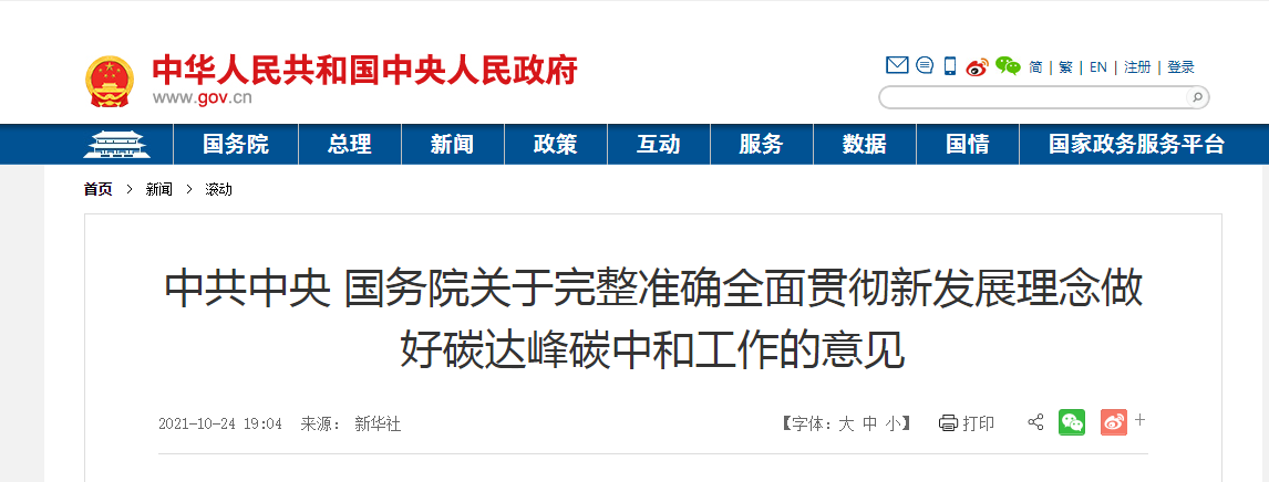 中共中央 国务院关于完整准确全面贯彻新发展理念做好碳达峰碳中和工作的意见