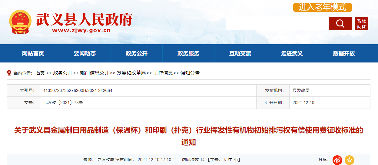 根据《浙江省排污权有偿使用和交易试点工作暂行办法》(浙政办发〔2010〕132号)、《浙江省初始排污权有偿使用费征收标准管理办法(试行)》(浙价资〔2011〕176号)、《浙江省生态环境厅关于印发全省生态环境系统2021年度改革工作计划>的通知》(浙环函[2021]75号)和《金华市生态环境局、金华市发展和改革委员会关于开展挥发性有机物(VOCs)排污权有偿使用和交易试点工作的通知》的规定,现就我县金属制日用品制造(保温杯)和印刷(扑克)挥发性有机物初始排污权有偿使用费征收标准通知如下: