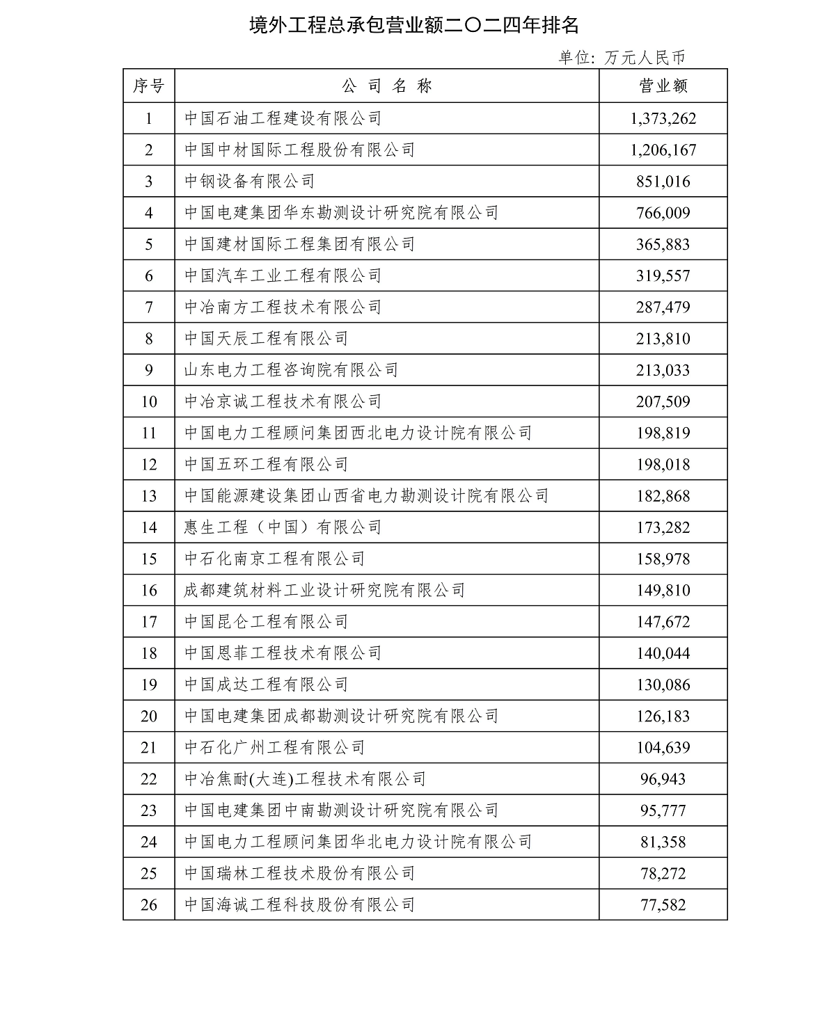 近日,中国勘察设计协会公布了勘察设计企业工程项目管理和工程总承包营业额2024年排名,其中,工程项目管理营业额排名88家企业上榜,中国石化工程建设有限公司以150,154万元位居榜首;工程总承包营业额排名183家企业上榜,中国电建集团华东勘测设计研究院有限公司以4,424,524万元位居榜首;境外工程项目管理营业额排名39家企业上榜,中国铁路设计集团有限公司以25,029万元位居榜首;境外工程总承包营业额排名79家企业上榜,中国石油工程建设有限公司以1,373,262万元位居榜首。