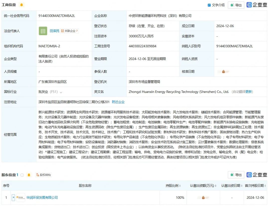 12月6日,中资环新能源循环利用科技(深圳)有限公司成立,法定代表人为田泽民,注册资本3亿人民币,经营范围含新兴能源技术研发、资源再生利用技术研发、资源循环利用服务技术咨询、太阳能发电技术服务、风力发电技术服务、储能技术服务、新能源汽车废旧动力蓄电池回收及梯次利用等,由华润环保发展有限公司全资持股。