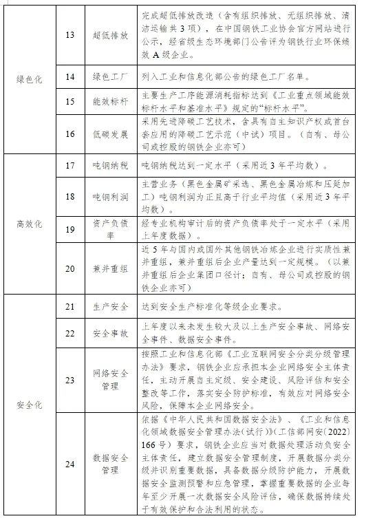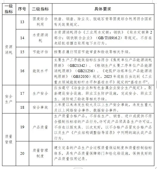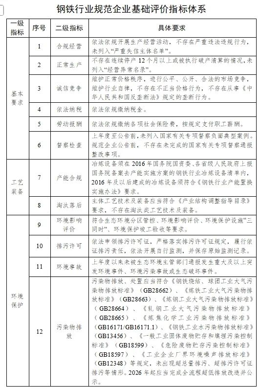 第五条基础指标是评价“规范企业”的依据,包含基本要求、工艺装备、环境保护、资源消耗、安全生产、质量管理6项一级指标、20项二级指标。(一)基本要求。依法依规开展生产经营活动,不存在严重违法违规行为,未列入“严重失信主体名单”,维护行业自律。正常生产,未列入“经营异常名录”。依法依规缴纳税款及社会保险费,按规定支付职工薪酬。不存在从事《中华人民共和国反垄断法》规定的垄断行为。规范企业公告前,不存在国家有关专项督察通报问题未整改完成事项。(二)工艺装备。所有冶炼设备须具备完备的项目建设手续,严格执行《钢铁行业产能置换实施办法》要求,现有主体工艺技术及装备符合《产业结构调整指导目录》要求,不存在淘汰类工艺技术及装备。(三)环境保护。符合生态环境分区管控、环境影响评价、环境保护设施“三同时”、环境保护竣工验收等要求。依法申领排污许可证,履行依证排污责任,落实重点污染物排放总量控制要求。2026年起完成全流程超低排放改造并公示。(四)资源消耗。资源综合利用符合国家有关规定。水资源消耗符合国家有关强制标准规定,不存在未经批准擅自取用地下水行为。按要求履行项目节能审查和验收等相关手续,2025年底前主要生产工序能效指标达到基准水平。(五)安全生产。落实安全生产主体责任,遵守《冶金企业和有色金属企业安全生产规定》,配套建设安全设施、职业卫生防护设施,具备安全、职业卫生、消防竣工验收等相关手续。上年度以来未发生较大及以上生产安全事故,未发生重大及以上网络安全事件、数据安全事件。