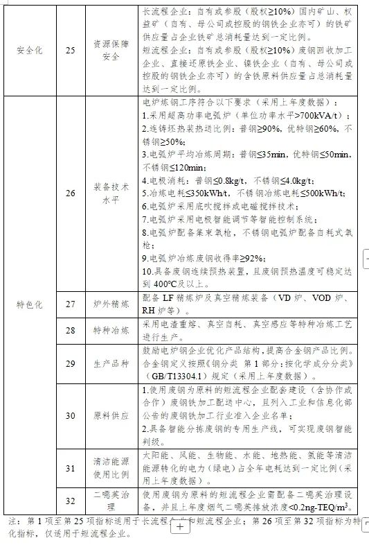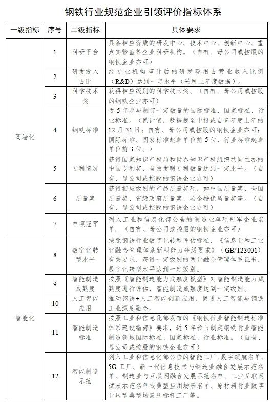 第六条引领指标是评价“引领型规范企业”的依据,包含高端化、智能化、绿色化、高效化、安全化、特色化6项一级指标、32项二级指标,合计130分。其中,高端化、智能化、绿色化、高效化、安全化指标属于通用指标,共25项二级指标,合计100分,适用于长流程企业和短流程企业;特色化指标共7项二级指标,合计30分,仅适用于短流程企业。(一)高端化。强化科技创新能力培育,建立科研机构,加大研发投入,持续提升企业工艺技术和产品创新能力,注重标准制修订和知识产权保护,强化企业质量品牌建设,积极培育制造业单项冠军企业。(二)智能化。积极推进数字化转型和智能化升级,落实《钢铁行业数字化转型实施指南》,开展智能制造能力成熟度评估评价,开展场景化、图谱化数字化转型,参与制定钢铁行业智能制造、数字化转型领域标准,创建智能工厂,参考《智能制造典型场景参考指引》《工业互联网与钢铁行业融合应用参考指南》,创新典型应用场景。(三)绿色化。积极推进绿色、低碳发展,推广应用先进绿色低碳工艺技术,建设应用工业绿色微电网,开展节能降碳技术改造,争创环保绩效A级、能效“标杆水平”。开发生产绿色产品,创建绿色工厂,鼓励培育创建“无废企业”。鼓励企业关停退出烧结机、焦炉、高炉等传统设备,转型发展低碳炼铁、电炉炼钢。鼓励开展产品碳足迹(CFP)、环境产品声明(EPD)、产品全生命周期评价(LCA)及环境、社会和公司治理(ESG)等工作。(四)高效化。持续提升生产经营管理水平,提高发展质量和效益,提升全要素生产率。积极开展兼并重组,促进行业集中度提升,优化产业布局和组织结构。加强对外交流与合作,提高国际化发展水平。(五)安全化。积极提升本质安全、生产安全水平,强化网络安全、数据安全管理能力。积极推进资源保障能力建设,提升铁矿、废钢/直接还原铁/镍铁等主要生产原料的保障能力。(六)特色化。短流程企业不断提高装备技术水平,提升生产经营效率,稳步提高劳动生产率、资源能源利用效率。优化产品结构,提升合金钢产品比例。提高废钢资源高效回收、高质利用能力。提升烟气余热回收利用和二噁英治理水平。第八条“引领型规范企业”符合全部基础指标,且引领指标总分不低于80分。其中,短流程企业在特色化指标部分得分不低于15分。第九条钢铁企业原则上以独立法人单位为主体进行申请,依据自身情况自愿合理选择申请“规范企业”或“引领型规范企业”。对于钢铁企业主要生产工序分属于不同法人,且同时满足各工序属于同一集团、位于同一生产区域、存在钢铁紧密上下游生产关系的情形,企业自主选择申报主体,以共同的集团企业法人或子公司为申报主体均可。第十条申请企业按照本规范条件规定的格式要求编制《钢铁行业规范企业申请报告》(以下简称《申请报告》,见附3),相关材料真实有效,不得弄虚作假。第十一条钢铁企业通过所在地区省级工业和信息化主管部门向工业和信息化部申请,于每年4月底前将《申请报告》报送省级工业和信息化主管部门,配合工业和信息化部开展复核工作。第十二条省级工业和信息化主管部门对本地区钢铁企业的《申请报告》进行初审,提出初审意见,附企业《申请报告》一并报送工业和信息化部。第十三条工业和信息化部负责组织复审,并对“引领型规范企业”组织开展现场核查,必要时对“规范企业”组织开展现场核查。