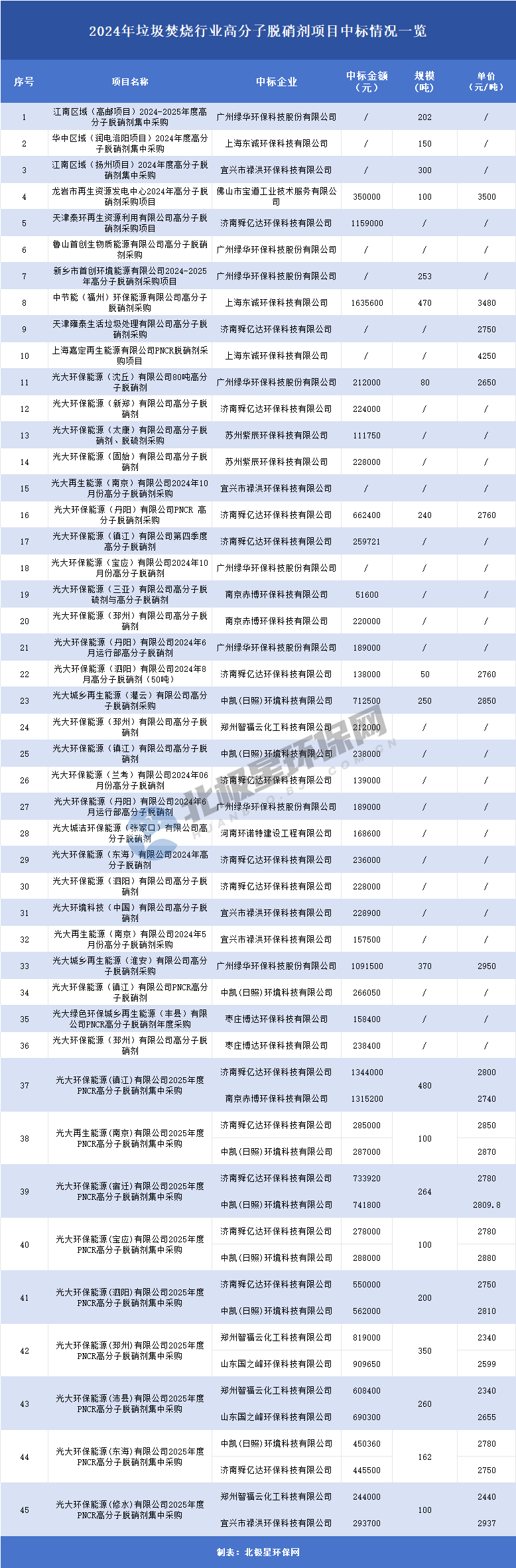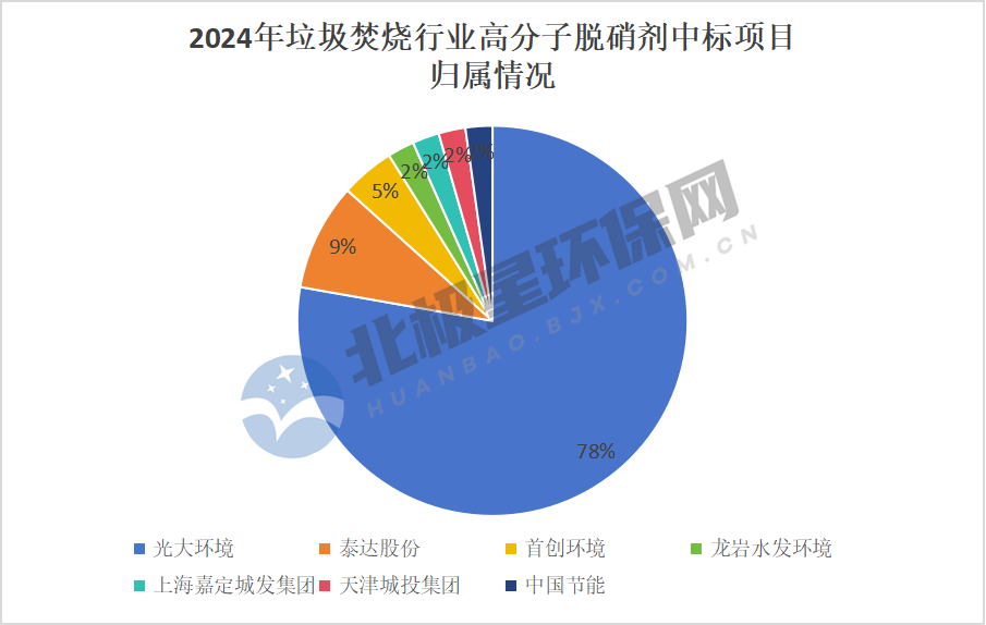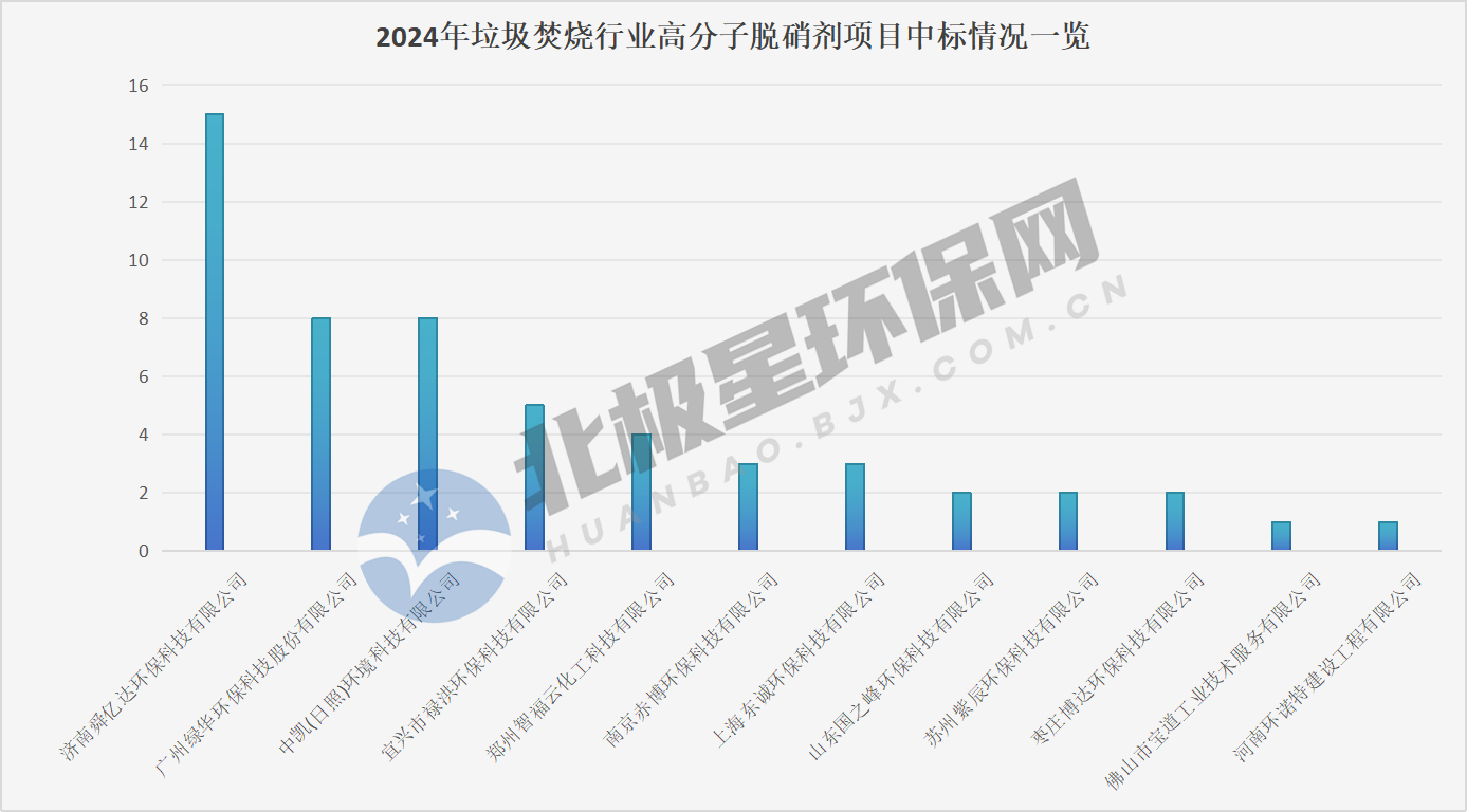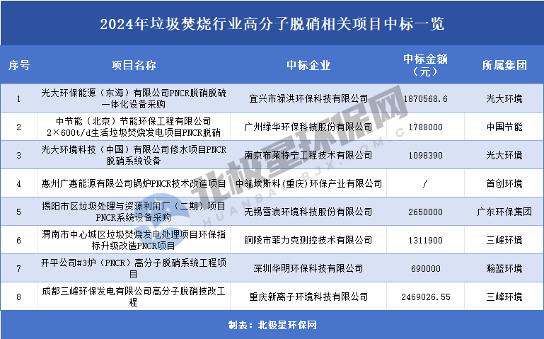 此外,北极星注意到,除高分子脱硝剂外,2024年还有部分高分子脱硝技术的相关项目中标,项目归属三峰环境、瀚蓝环境等垃圾焚烧集团。详情如下: