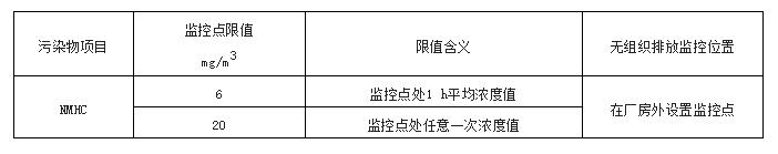 6、厂区内VOCs无组织排放限值,监控点处1 h平均浓度值不高于6,监控点处任意一次浓度值不高于20;