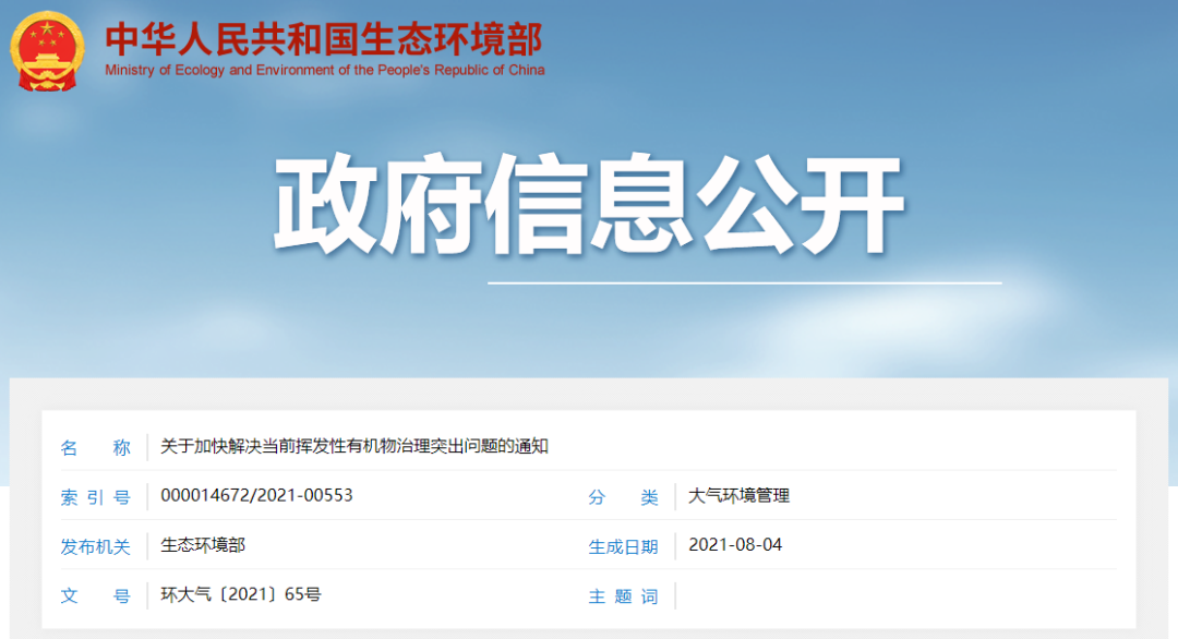 为深入打好污染防治攻坚战,强化细颗粒物(PM2.5)和臭氧(O3)协同控制,落实相关法律法规标准等要求,日前生态环境部于8月4日正式印发《关于加快解决当前挥发性有机物治理突出问题的通知》(环大气〔2021〕65号)。