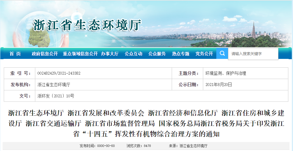 为深入推进“十四五”挥发性有机物治理,进一步改善环境空气质量,依据《中华人民共和国大气污染防治法》《浙江省大气污染防治条例》和《浙江省空气质量改善“十四五”规划》,我们制定了《浙江省“十四五”挥发性有机物综合治理方案》。现印发给你们,请认真贯彻落实。