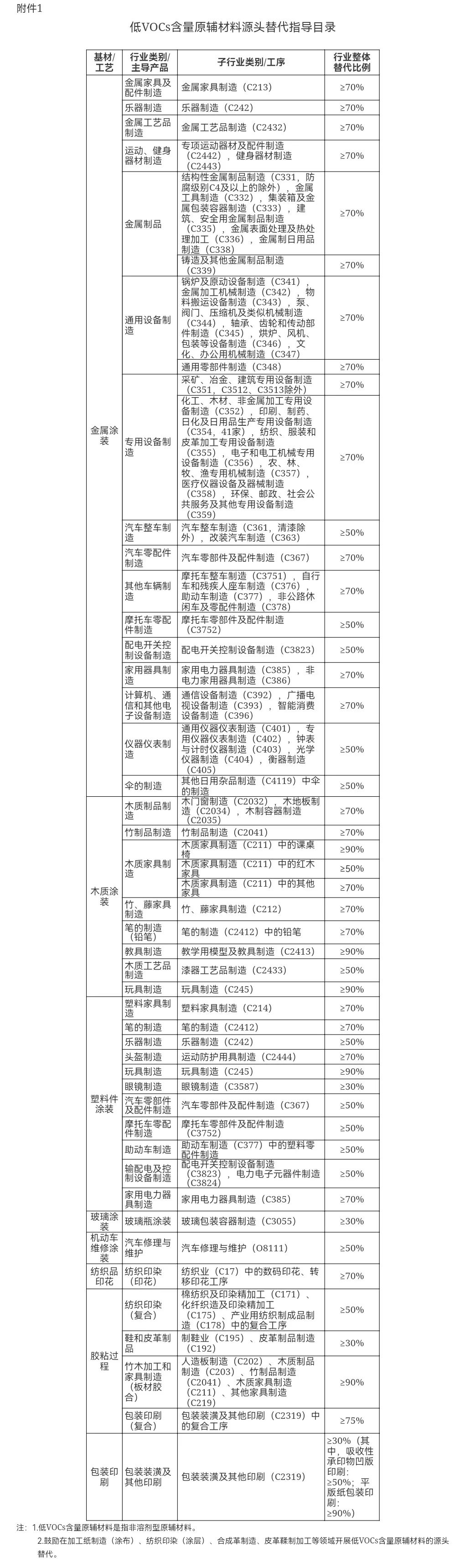 5.大力推进低VOCs含量原辅材料的源头替代。全面排查使用溶剂型工业涂料、油墨、胶粘剂、清洗剂等原辅材料的企业,各地应结合本地产业特点和本方案指导目录(见附件1),制定低VOCs含量原辅材料源头替代实施计划,明确分行业源头替代时间表,按照“可替尽替、应代尽代”的原则,实施一批替代溶剂型原辅材料的项目。加快低VOCs含量原辅材料研发、生产和应用,在更多技术成熟领域逐渐推广使用低VOCs含量原辅材料,到2025 年,溶剂型工业涂料、油墨、胶粘剂等使用量下降比例达到国家要求。(省生态环境厅牵头,省经信厅等配合)
