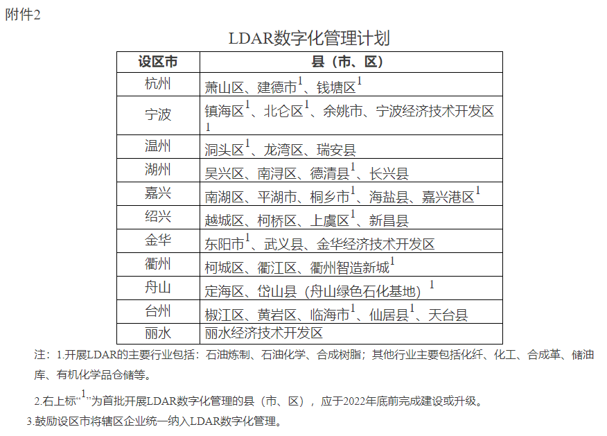 7.全面开展泄漏检测与修复(LDAR)。石油炼制、石油化学、合成树脂企业严格按照行业排放标准要求开展LDAR工作;其他企业载有气态、液态VOCs物料设备与管线组件密封点大于等于2000个的,应开展LDAR工作。开展LDAR企业3家以上或辖区内开展LDAR企业密封点数量合计1万个以上的县(市、区)应开展LDAR数字化管理,到2022年, 15个县(市、区)实现LDAR数字化管理;到2025年,相关重点县(市、区)全面实现LDAR数字化管理(见附件2)。(省生态环境厅牵头)