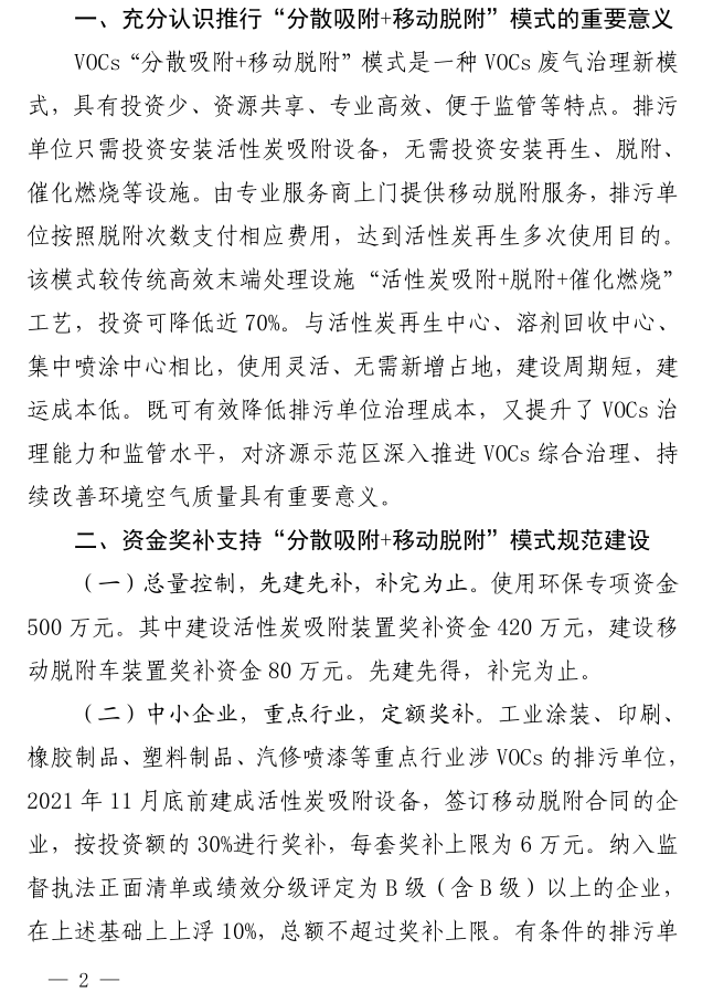 文件指出,要充分认识推行“分散吸附+移动脱附”模式的重要意义。VOCs“分散吸附+移动脱附”模式是一种VOCs废气治理新模式,具有投资少、资源共享、专业高效、便于监管等特点。排污单位只需投资安装活性炭吸附设备,无需投资安装再生、脱附、催化燃烧等设施。由专业服务商上门提供移动脱附服务,排污单位按照脱附次数支付相应费用,达到活性炭再生多次使用的目的。该模式较传统高效末端处理设施“活性炭吸附+脱附+催化燃烧”工艺,投资可降低近70%。与活性炭再生中心、溶剂回收中心、集中喷涂中心相比,使用灵活、无需新增占地,建设周期短,建运成本低。既可有效降低排污单位治理成本,又提升了VOCs治理能力和监管水平,对济源示范区深入推进VOCs综合治理、持续改善环境空气质量具有重要意义。