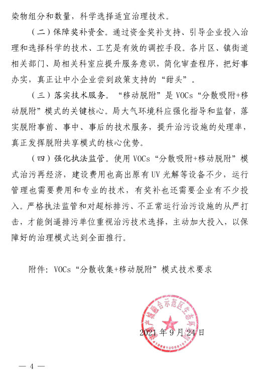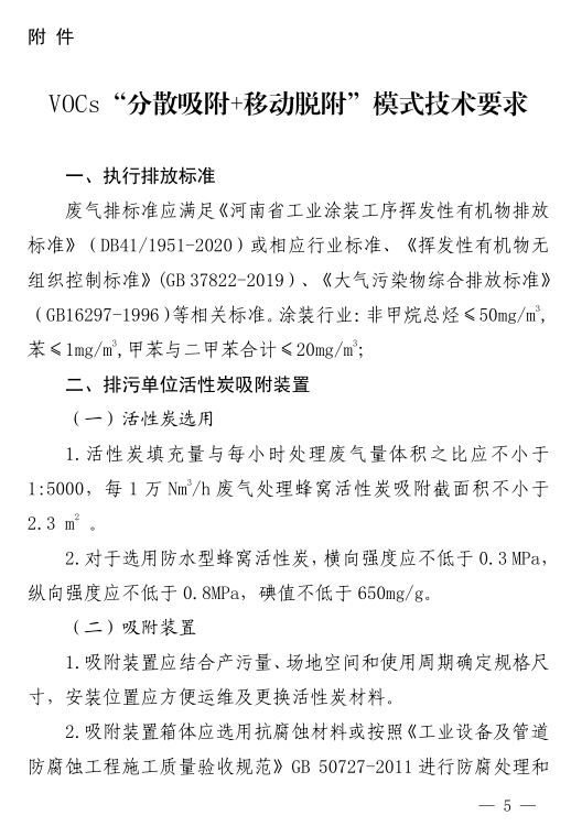 4. 统一标准,规范建设,专业服务。申请奖补的排污单位和进行脱附服务的单位必须按照《“分散吸附+移动脱附”模式建设技术要求》建设活性炭吸附设备和脱附服务车,签订建运服务合同。进行脱附服务的单位应有相应的专业人员,建有运行有效的服务质控体系,做出脱附服务的书面承诺。