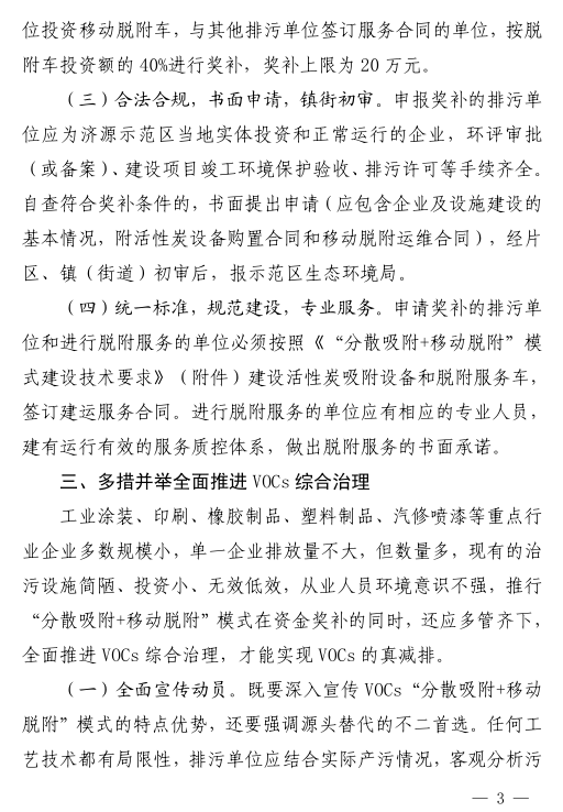3. 合法合规,书面申请,镇街初审。申报奖补的排污单位应为济源示范区当地实体投资和正常运行的企业,环评审批(或备案)、建设项目竣工环境保护验收、排污许可等手续齐全。自查符合奖补条件的,书面提出申请(应包含企业及设施建设的基本情况,附活性炭设备购置合同和移动脱附运维合同),经片区、镇(街道)初审后,报示范区生态环境局。