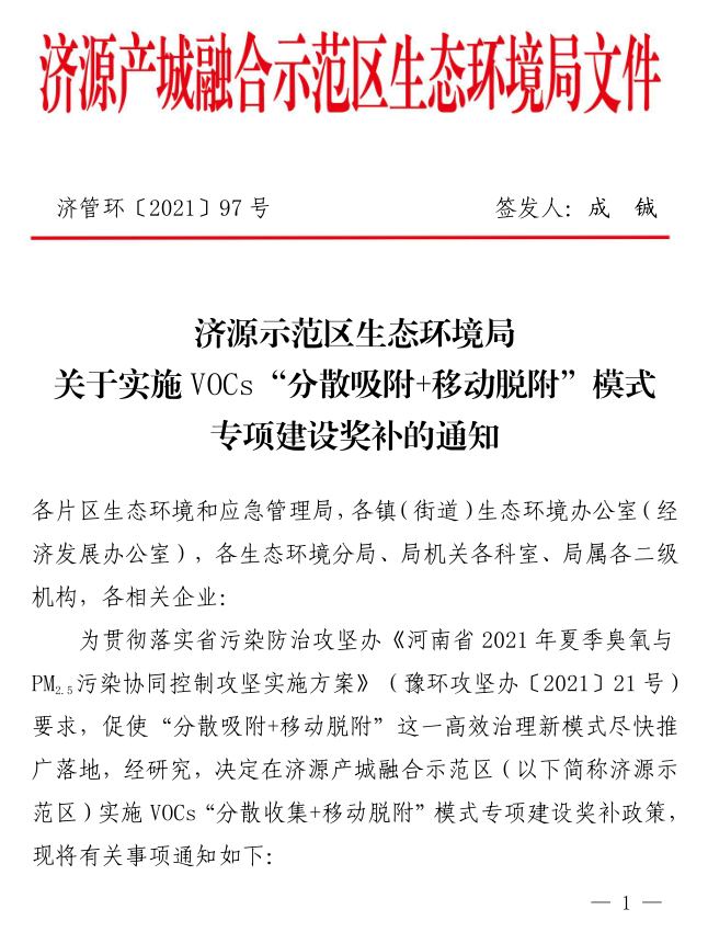 9月24日,河南省济源生态环境局印发《关于实施VOCs“分散吸附+移动脱附”模式专项建设奖补的通知》,决定对按要求建设VOCs“分散吸附”和“移动脱附”的相关企业进行资金奖补,力促这一高效治理新模式在济源落地生根。