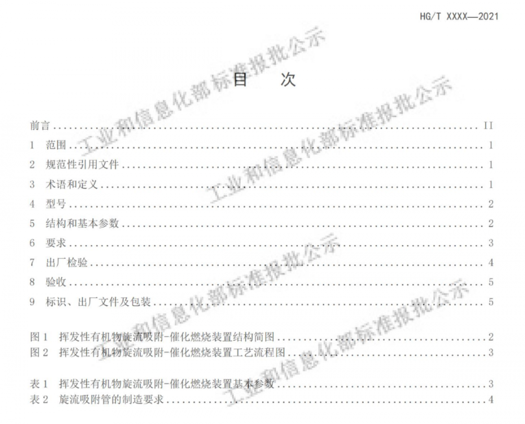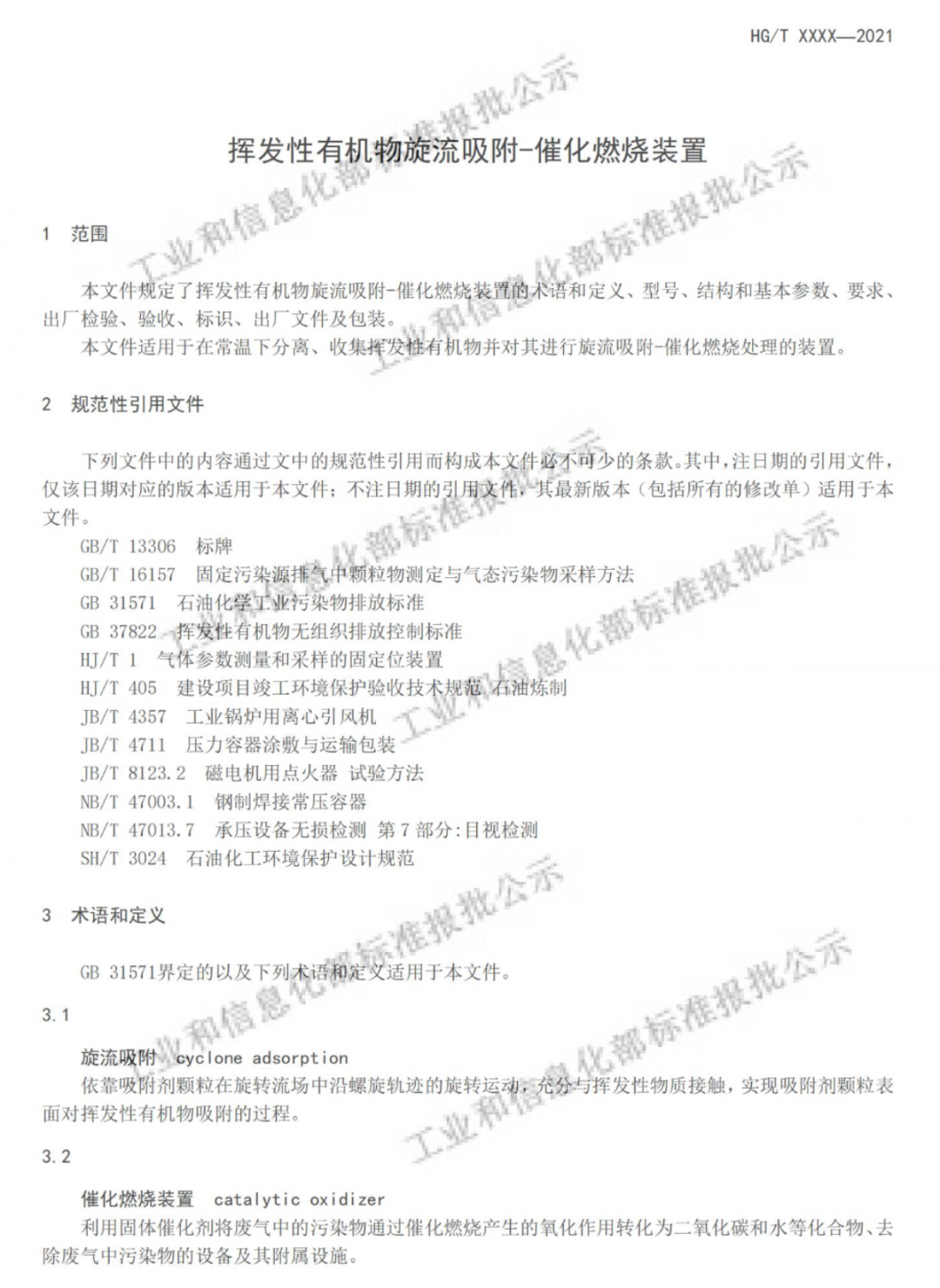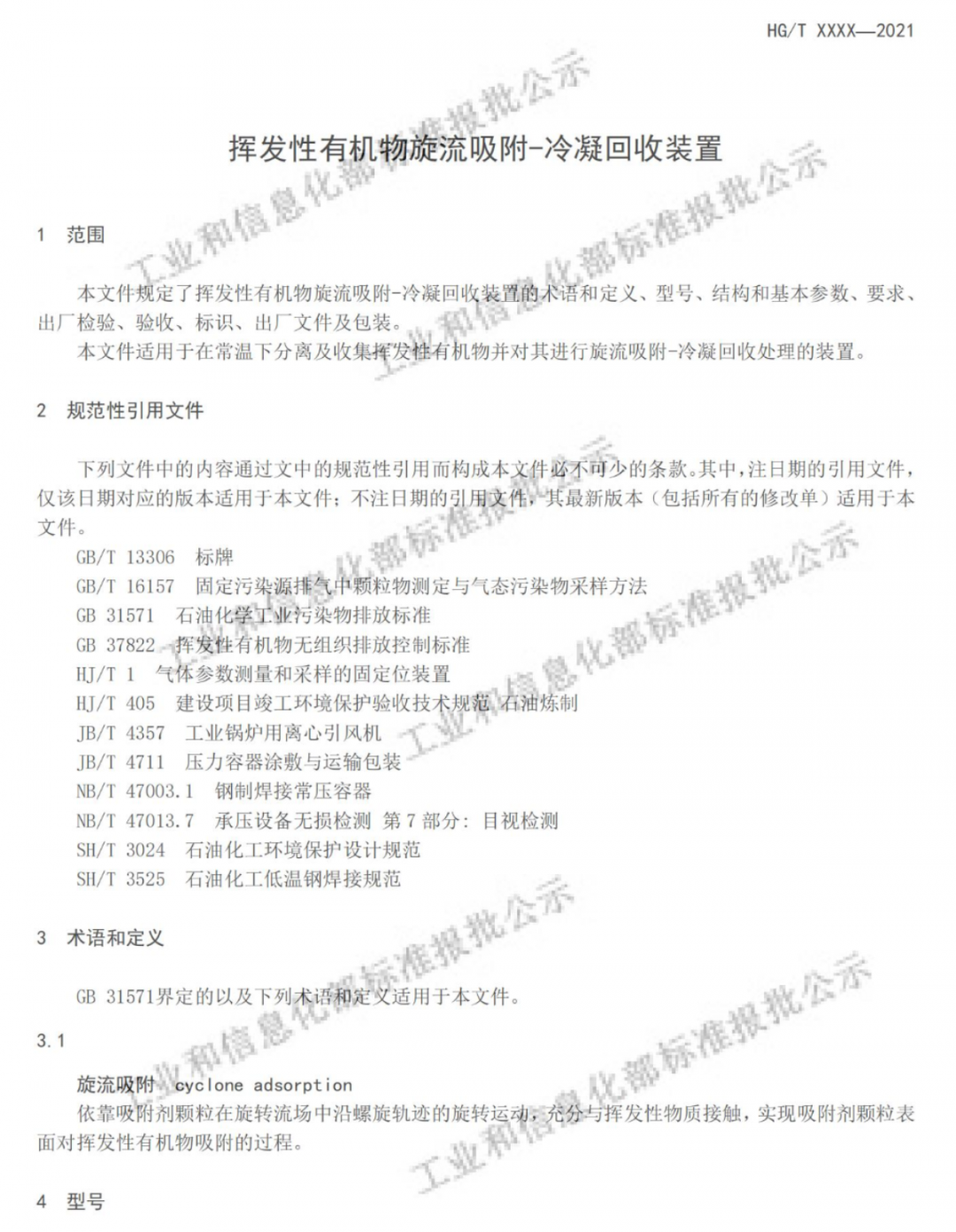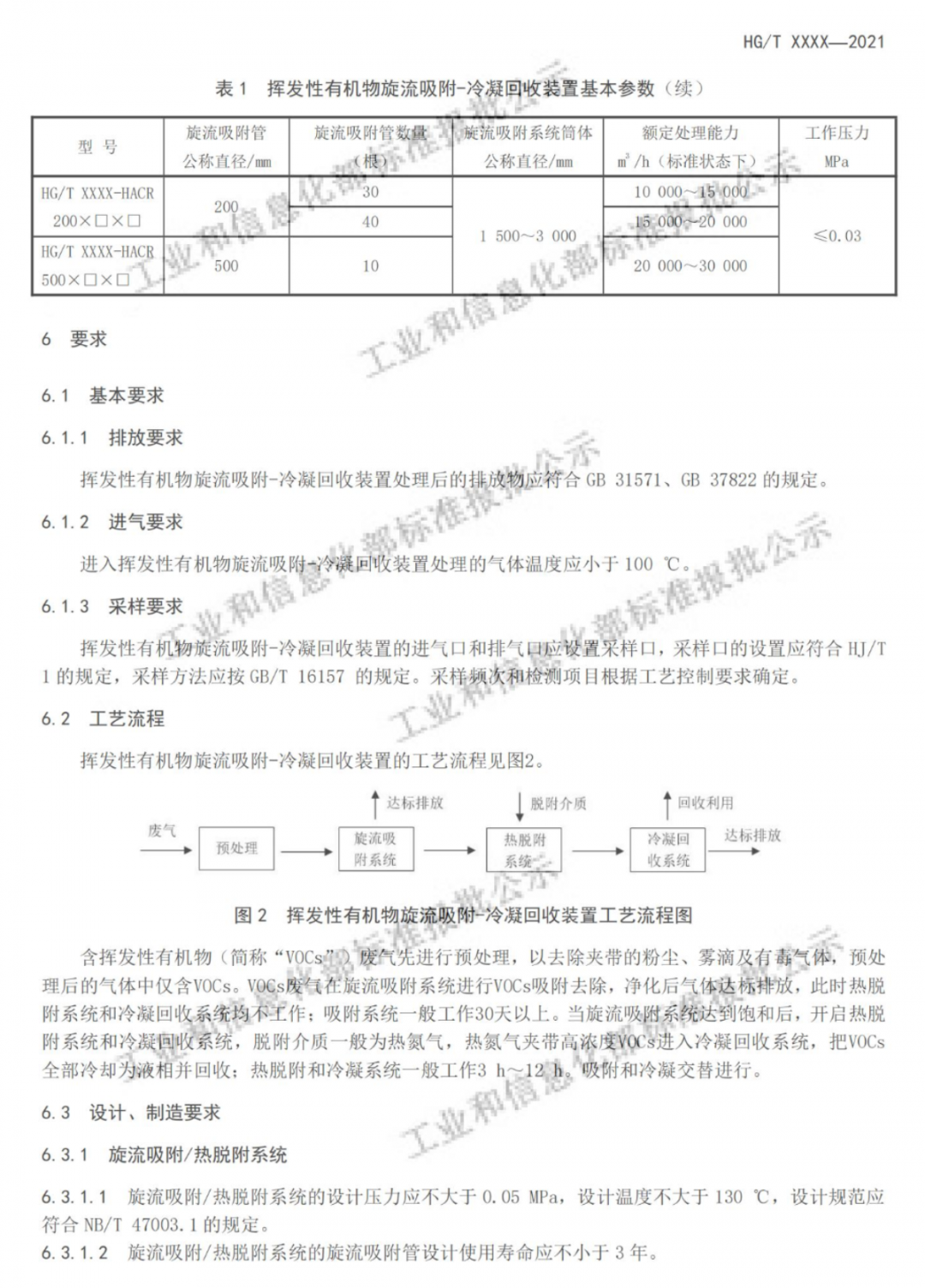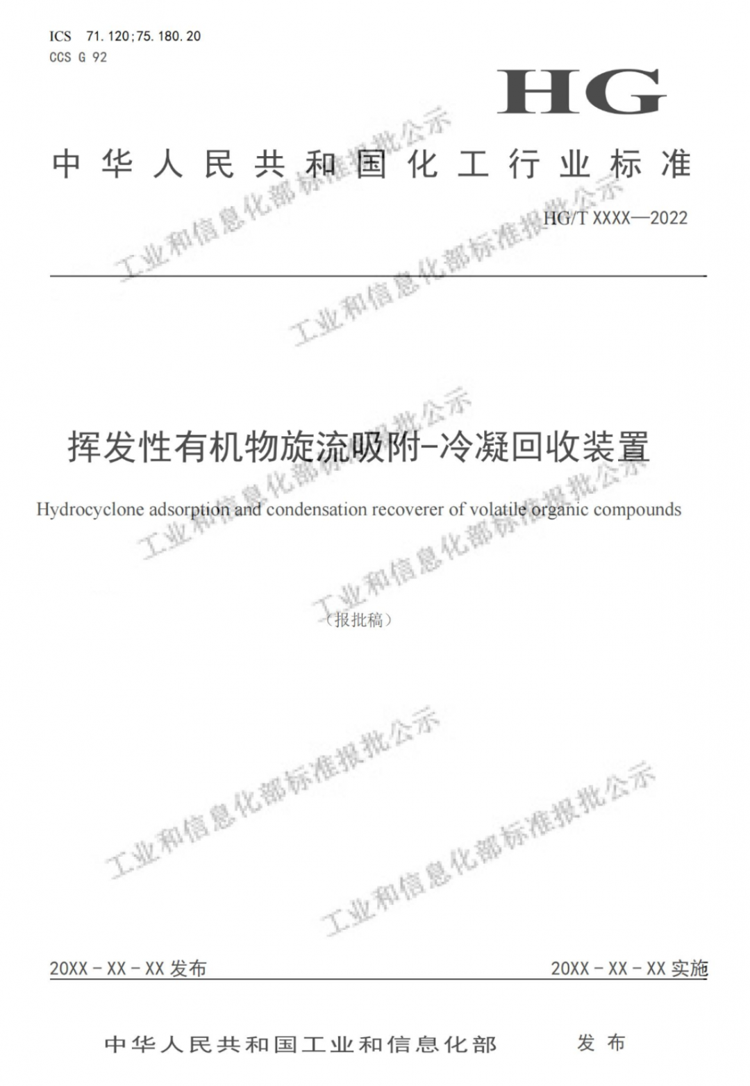 日前,工业和信息化部对一批行业标准进行报批公示,其中包括《挥发性有机物旋流吸附-催化燃烧装置》HG/T 5998-2022和《挥发性有机物旋流吸附-冷凝回收装置》HG/T 5999-2022这两项行业标准。