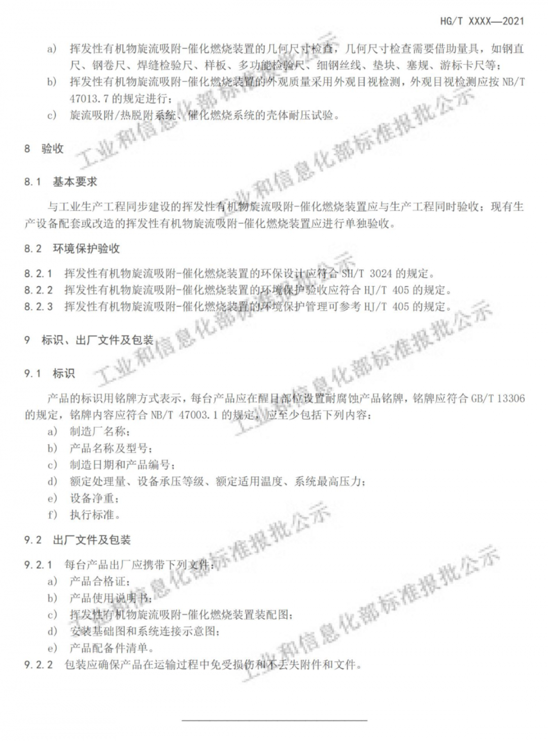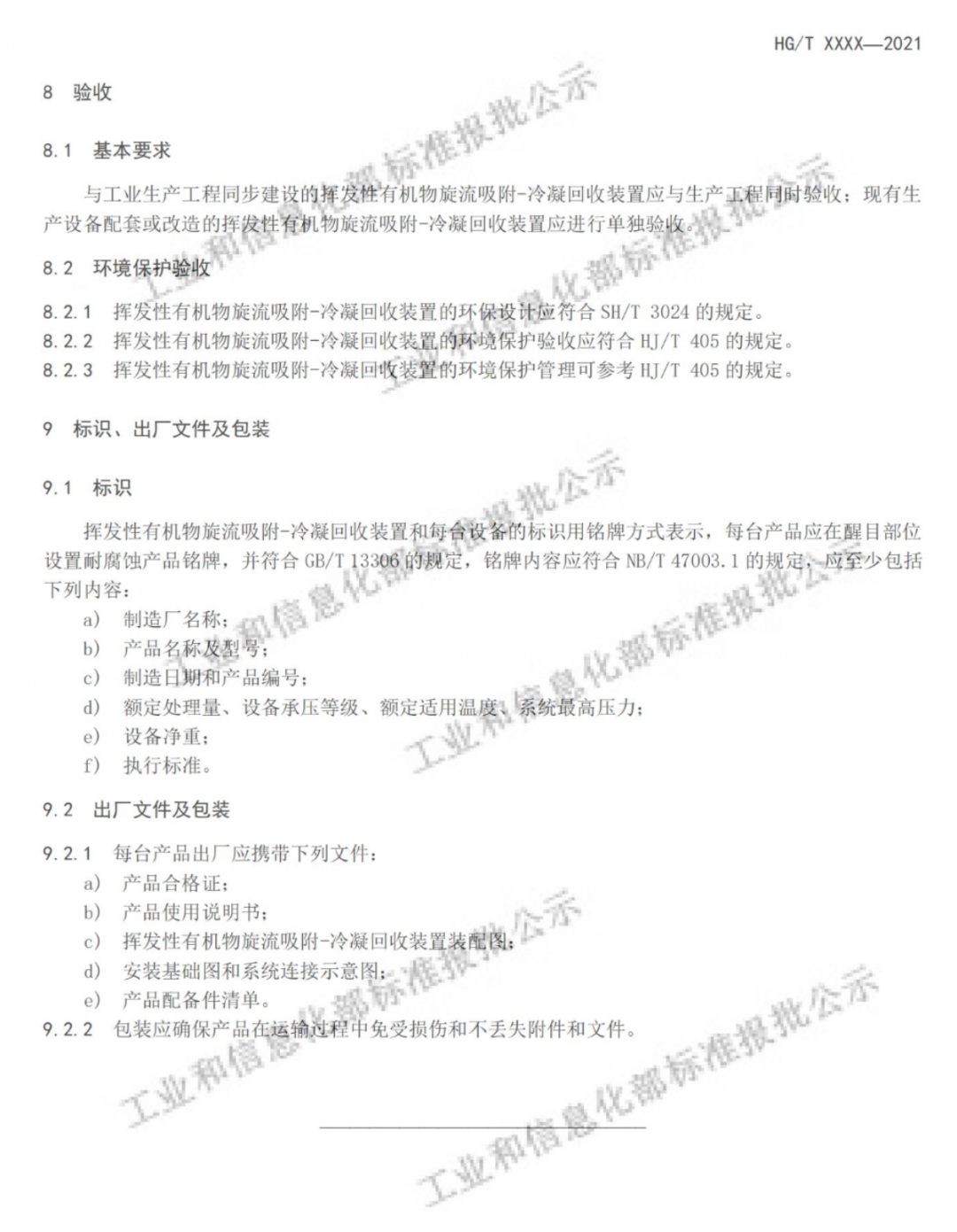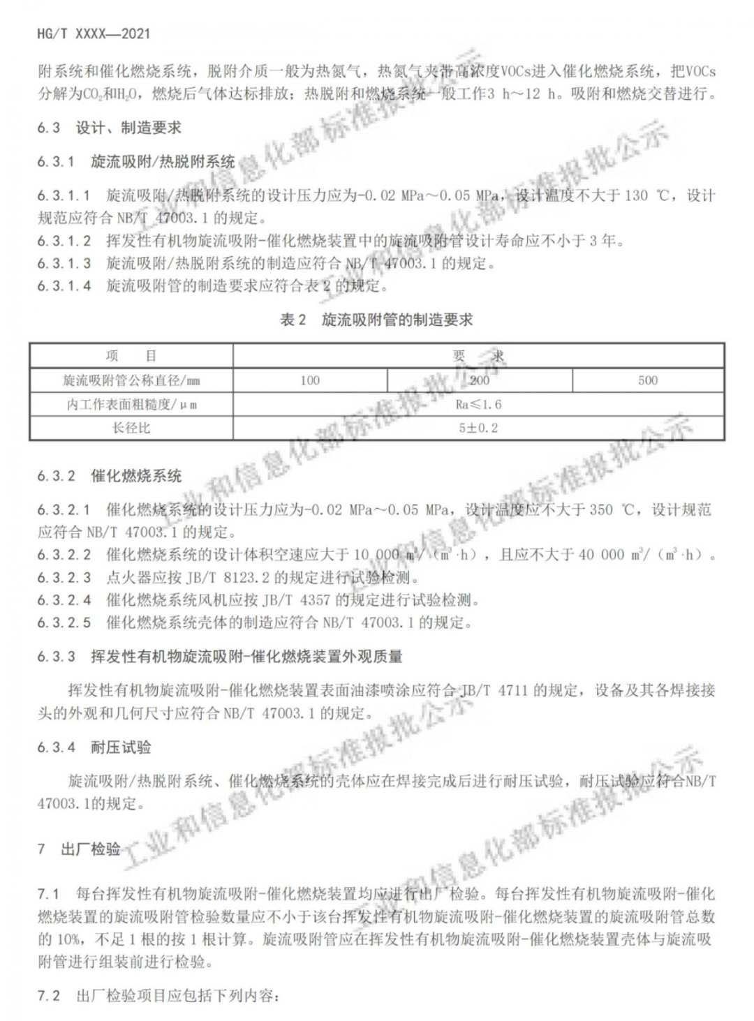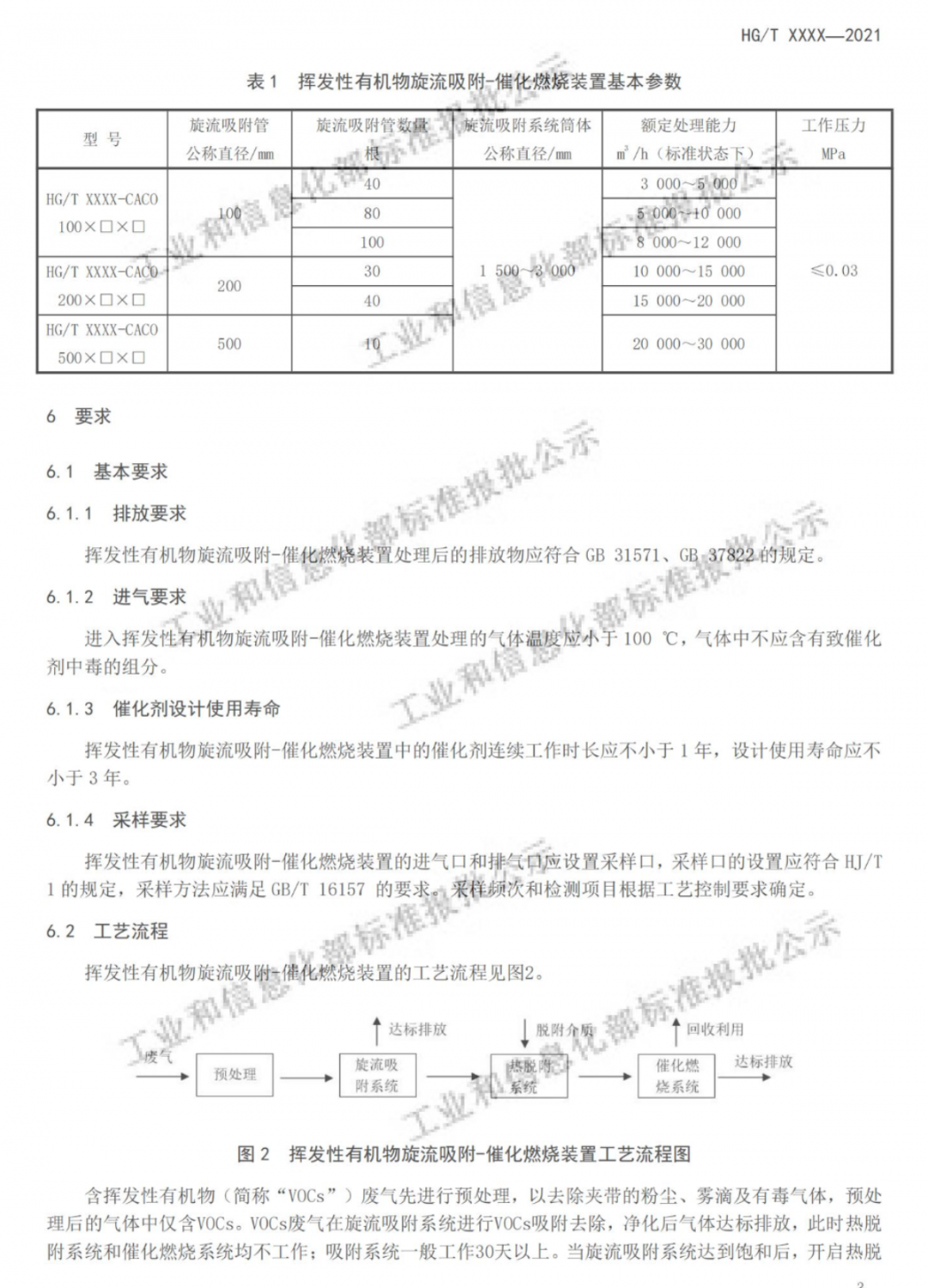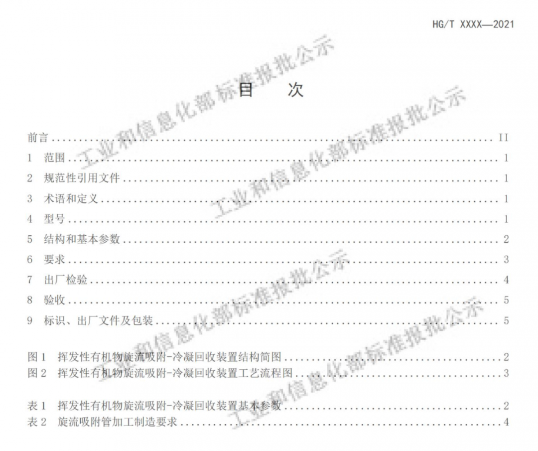 日前,工业和信息化部对一批行业标准进行报批公示,其中包括《挥发性有机物旋流吸附-催化燃烧装置》HG/T 5998-2022和《挥发性有机物旋流吸附-冷凝回收装置》HG/T 5999-2022这两项行业标准。