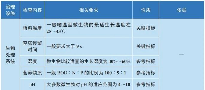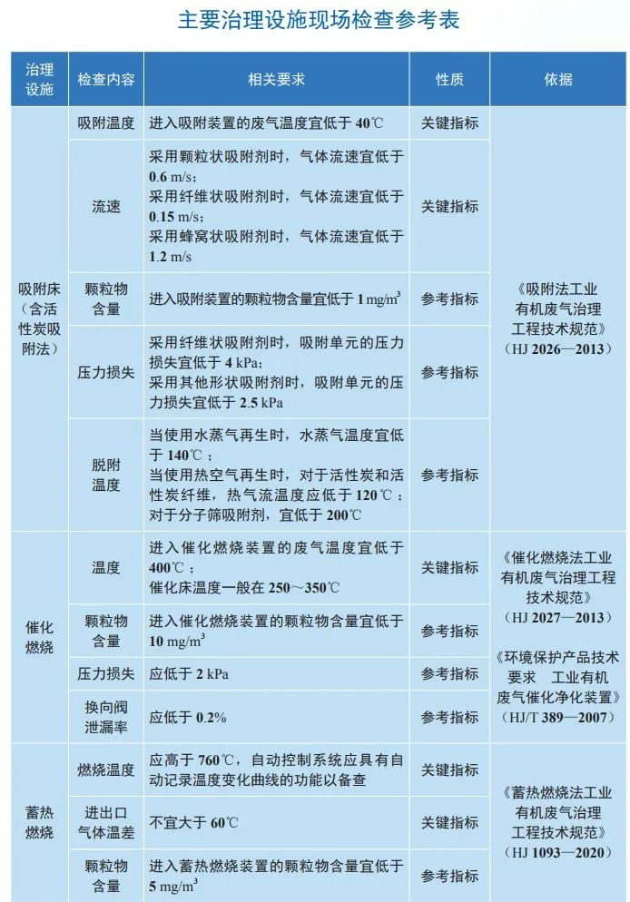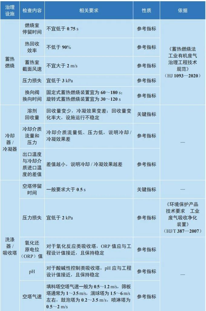 生态环境部发布的《重点行业企业挥发性有机物现场检查指南(试行)》一书中,文末附“主要治理设施现场检查参考表”,就吸附床(含活性炭吸附法)、催化燃烧、蓄热燃烧、冷却器 / 冷凝器、洗涤器 / 吸收塔、生物处理系统等不同VOCs治理设施现场检查的检查内容,相关要求,性质、依据进行了汇总,同时明确了关键指标及参考指标。现贴表如下,以供参考。