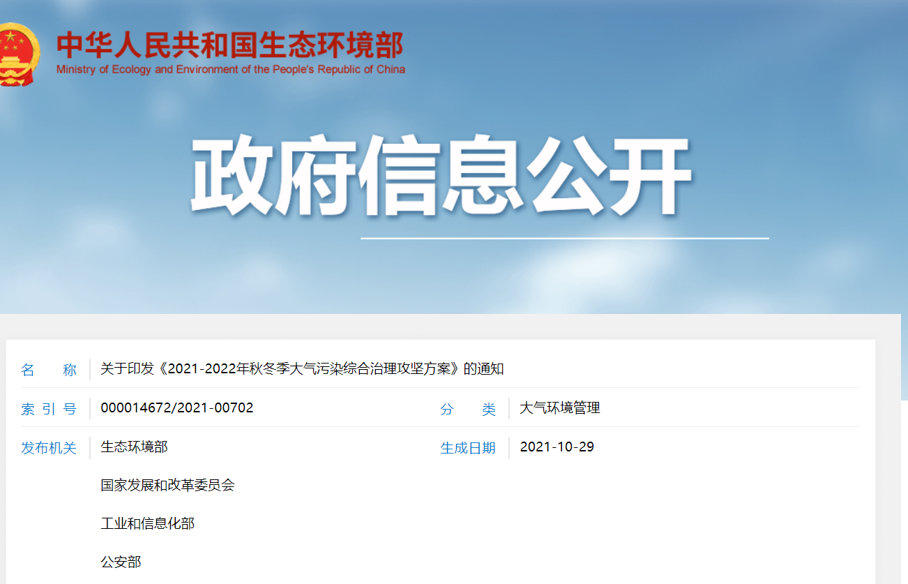 近日,生态环境部发布关于印发《2021-2022年秋冬季大气污染综合治理攻坚方案》的通知。要求充分认识2021-2022年秋冬季大气污染综合治理工作的重要性和紧迫性,精准扎实推进各项任务措施,通过持续开展秋冬季攻坚行动,着力打好重污染天气消除攻坚战,为“十四五”深入打好蓝天保卫战开好局、起好步。