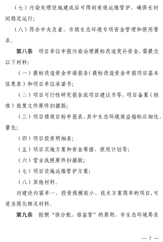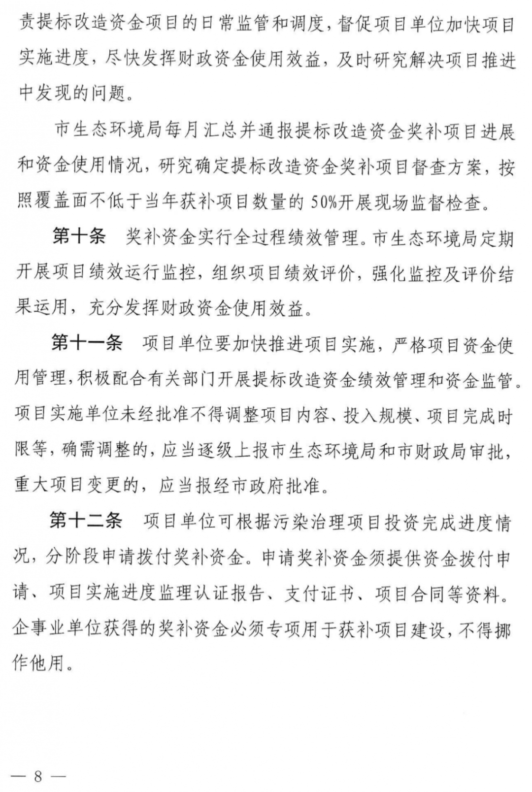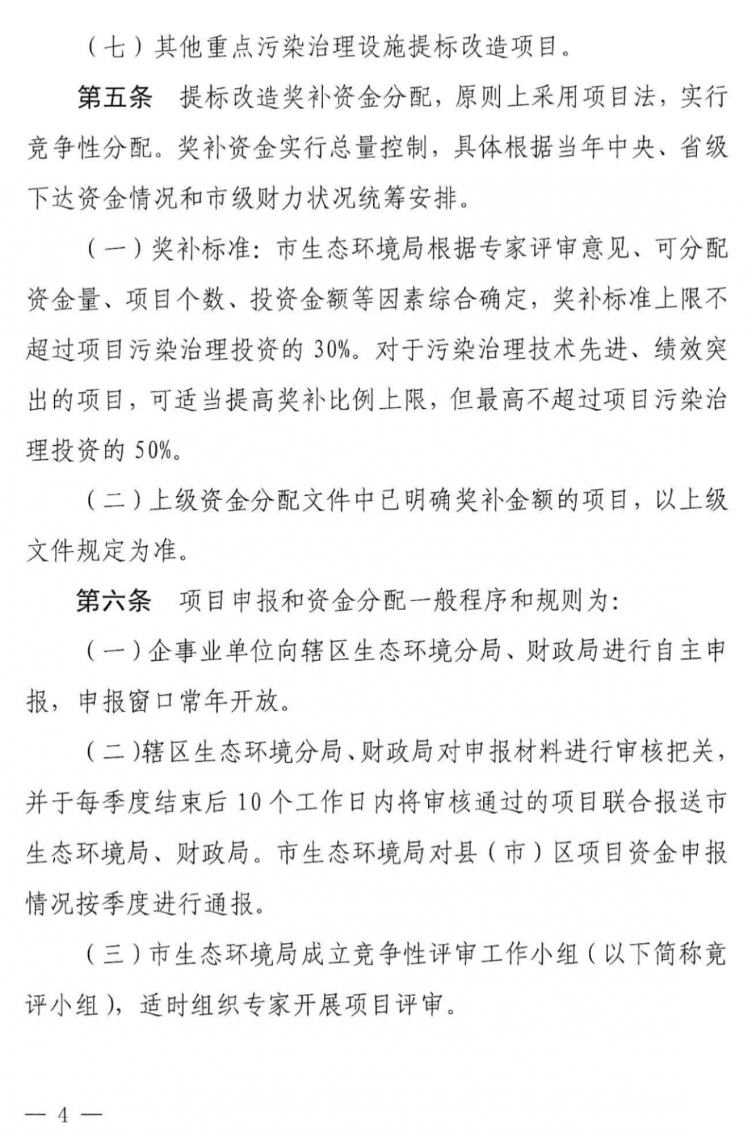 本办法所称“提标改造”项目是指企事业单位在达标排放或已达到当地环境监管要求的基础上自愿实施的污染防治设施提标改造项目。市生态环境局会同市财政局对符合本办法支持条件的企事业单位污染治理提标改造项目给予一定额度资金奖补。