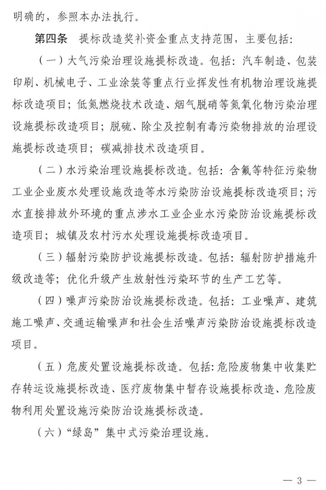 一是聚焦重点。《办法》瞄准我市产业发展方向、重点污染源行业、群众信访投诉热点、“十四五”污染减排重点、专项资金支持方向等,将大气、水、辐射、危废、噪声等5大类涉企污染防治设施提标改造项目纳入奖补资金重点支持范围。包含:汽车制造、工业涂装等重点行业挥发性有机物治理、低氮燃烧技术改造、烟气脱硝等氮氧化物污染治理、含氟等特征污染物工业企业废水处理、危废医废处置、碳减排技术改造、“绿岛”集中式污染治理等重点领域。