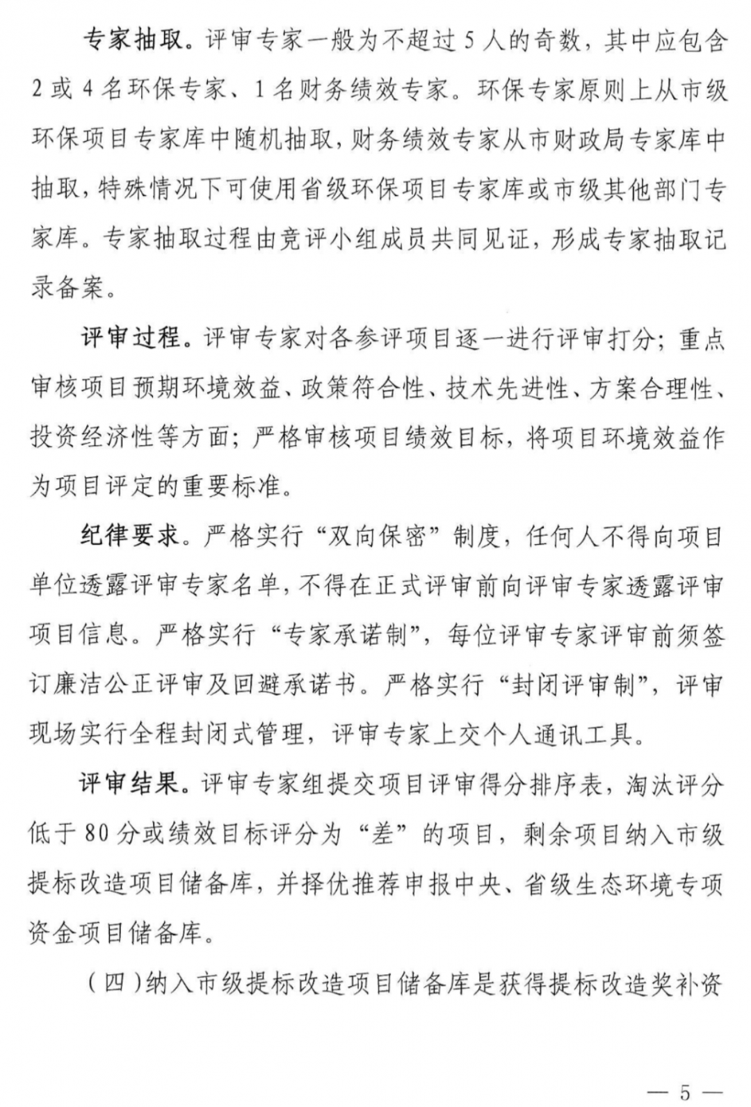 三是规范程序。《办法》按照项目申报、专家评审、资金分配、过程监管、资金拨付、竣工验收的顺序,对奖补资金管理使用的各个环节作出细致规定,主要体现在以下3个方面:申报储备常态化。《办法》提出建设提标改造资金项目储备库的要求,按照先入库再分配的原则,通过常态化组织项目申报、适时评审入库、分配资金出库的方式实现项目库的动态管理。专家评审制度化。《办法》明确提标改造奖补资金实行竞争性分配,将专家评审意见作为资金分配的重要依据,并就专家抽取、评审程序等作出了详实细致的规定,以最大限度减少人为因素干扰,防范廉政风险,确保公平公正、竞争择优。监管验收规范化。《办法》进一步规范了资金项目监管验收的程序和要求,确定了以日常监督调度与现场检查相结合的方式加强资金监管,明确了按照奖补资金额度划分市县两级生态环境部门的验收责任,并对验收资料作出具体要求。