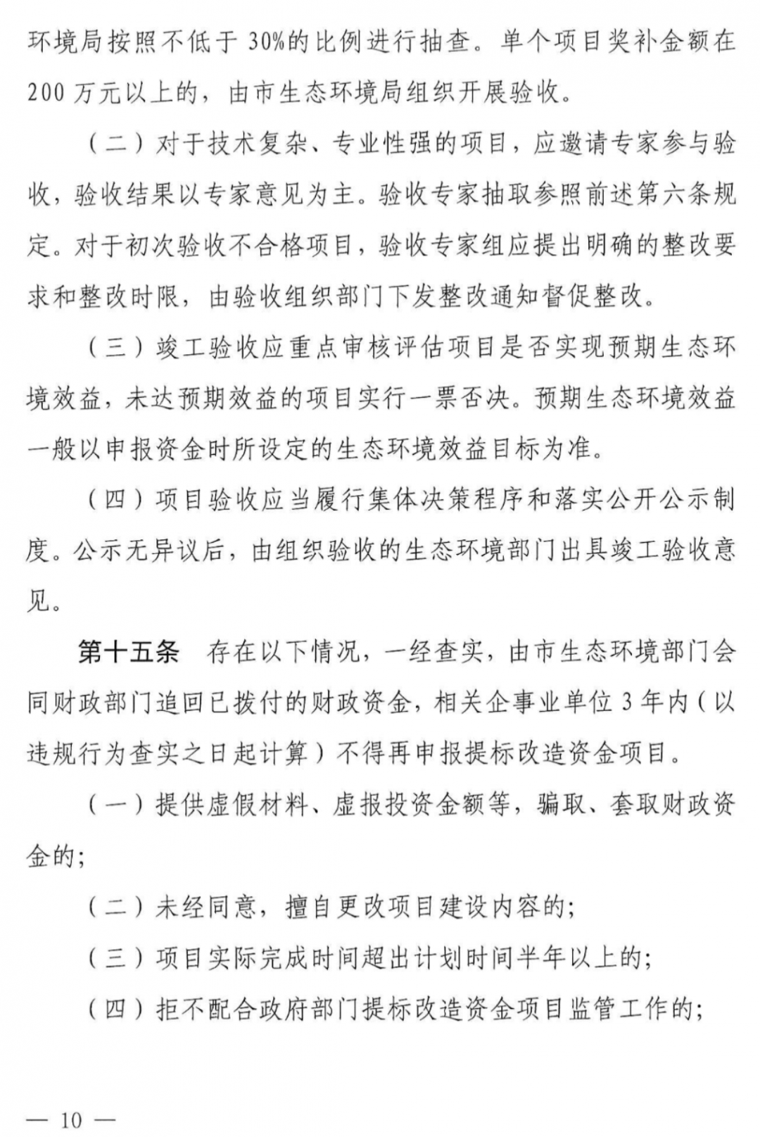 四是明确项目验收管理规定(第十三至十四条)。根据奖补资金管理实际,分类细化项目验收责任主体、规范验收程序和验收资料,要求重点审核评估项目是否实现预期生态环境效益,根据实际需要适时引入专家协助开展验收,并严格履行集体决策程序和落实公开公示制度。
