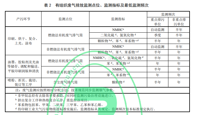 自2022年7月1日起,生态环境部发布的《排污单位自行监测技术指南 印刷工业》正式实施,该指南对排污单位各产污环节有组织废气排放监测点位、监测指标及最低监测频次作了明确要求。
