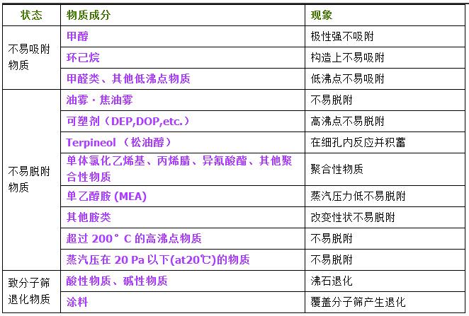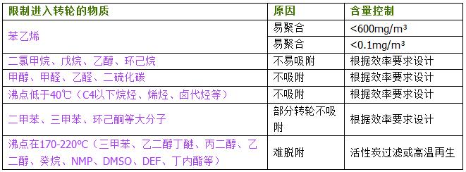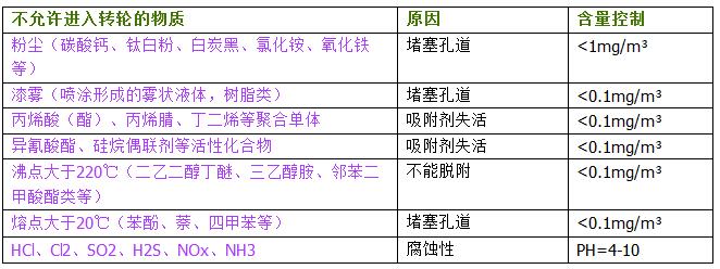 在分子筛转轮上易发生聚合反应的烯烃类物质、有机硅氧烷、沸点超高260℃以上的大分子物质等,可能会对转轮造成永久性损坏。