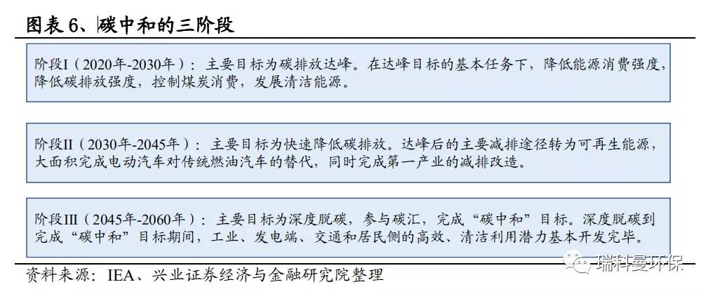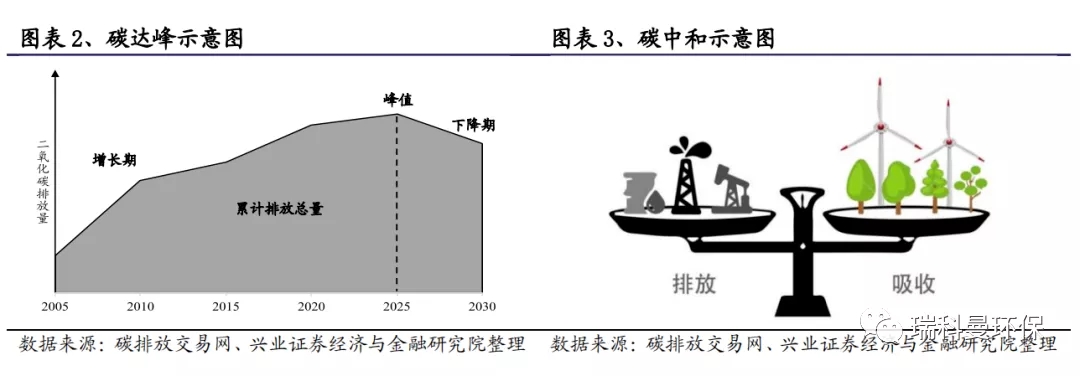 广义来说,碳达峰是指某一个时点,二氧化碳的排放不再增长达到峰值,之后逐步回落。根据世界资源研究所的介绍,碳达峰是一个过程,即碳排放首先进入平台期并可以在一定范围内波动,之后进入平稳下降阶段。碳达峰是实现碳中和的前提条件,尽早地实现碳达峰可促进碳中和的早日实现。据此,结合我国的承诺的时间节点:1)从现在至 2030 年,我国的碳排放仍将处于一个爬坡期;2)2030-2060 年这 30 年间,碳排放要渡过平台期并最终完成减排任务。碳中和是指企业、团体或个人测算在一定时间内直接或间接产生的温室气体排放总量,然后通过植树造林、节能减排等形式,抵消自身产生的二氧化碳排放量,实现二氧化碳“零排放”。