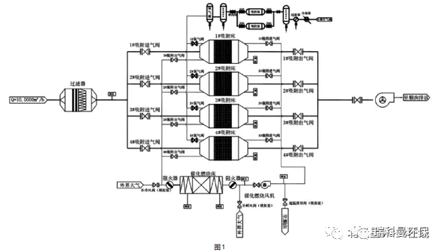 其工艺流程如图1 所示。图 1 中以 10,0000Nm3 /h 风量,浓度约在 200mg/Nm3 的废气处理项目为例。碳箱、催化炉以及整个系统设计如图所示,仅供参考。这2个工艺组合起来,非常适合在大风量,浓度在200mg/ Nm3 左右的工况下使用,既弥补了单纯靠活性炭吸附造成活性炭浪费,不能重复利用的缺点,又弥补了单纯靠催化燃烧炉,运行费用高昂的问题,同时相比较起来其一次性投资成本也降低不少。