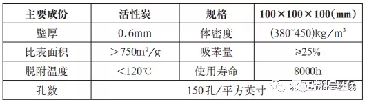 碳箱里面活性炭的选择非常重要,因为要反复经过吸脱附,所以其质量要比吸附即抛型活性炭要好,其使用时间可达 8000小时。应选用以优质无烟煤作为原料、经过高温石墨化预制,外形蜂窝状为宜。蜂窝活性炭具有空气动力性能好,床层阻力小,吸脱附速度快,适合处理大风量,低浓度有机废气。其规格参数表如下。