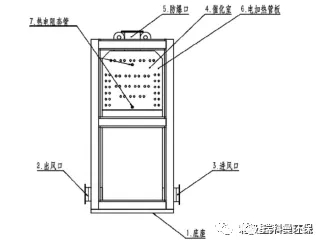 催化床层预热一般采用电加热。如果采用燃烧器,需要与催化剂保持一定距离,以免对催化剂造成损害。现在催化炉较为普遍的做法是将催化床与换热器做在一起,比较紧凑,方便运输。其结构如下图所示: