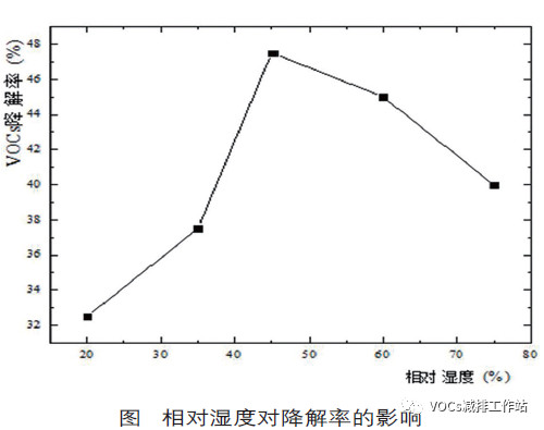 从上图的数据可以看到,随着湿度增大,在湿度50% 时,降解率升到一个极点。但随着湿度增大,降解率又开始下降。所以光催化氧化法不是越干燥越好,也不是湿度越高就越好。UV 光生成的臭氧,需要与部分水汽反应生成氢氧自由基或负氧离子增强介质的反应活性才可能增大与VOCs 的反应几率。总之,单独的紫外光解技术的弊端是,受催化剂、湿度、灰尘颗粒物的影响,紫外灯大部份能量用于产生臭氧,短时间光解VOCs 做不到彻底,反而产生更复杂的中间副产物,造成二次污染,此外,如果采用市面上的二氧化钛材料,不是锐钛矿型二氧化钛光触媒,完全没有催化光解功效。