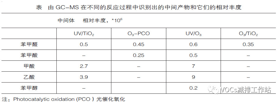 目前普遍研究认为光催化氧化法能够将VOCs 完全降解生成无毒无害的CO2 和H2O等,但是在实际工程实践中VOCs 的光催化氧化反应会生成酮、醛等中间产物,对环境造成二次污染。如下表所示实验结果。
