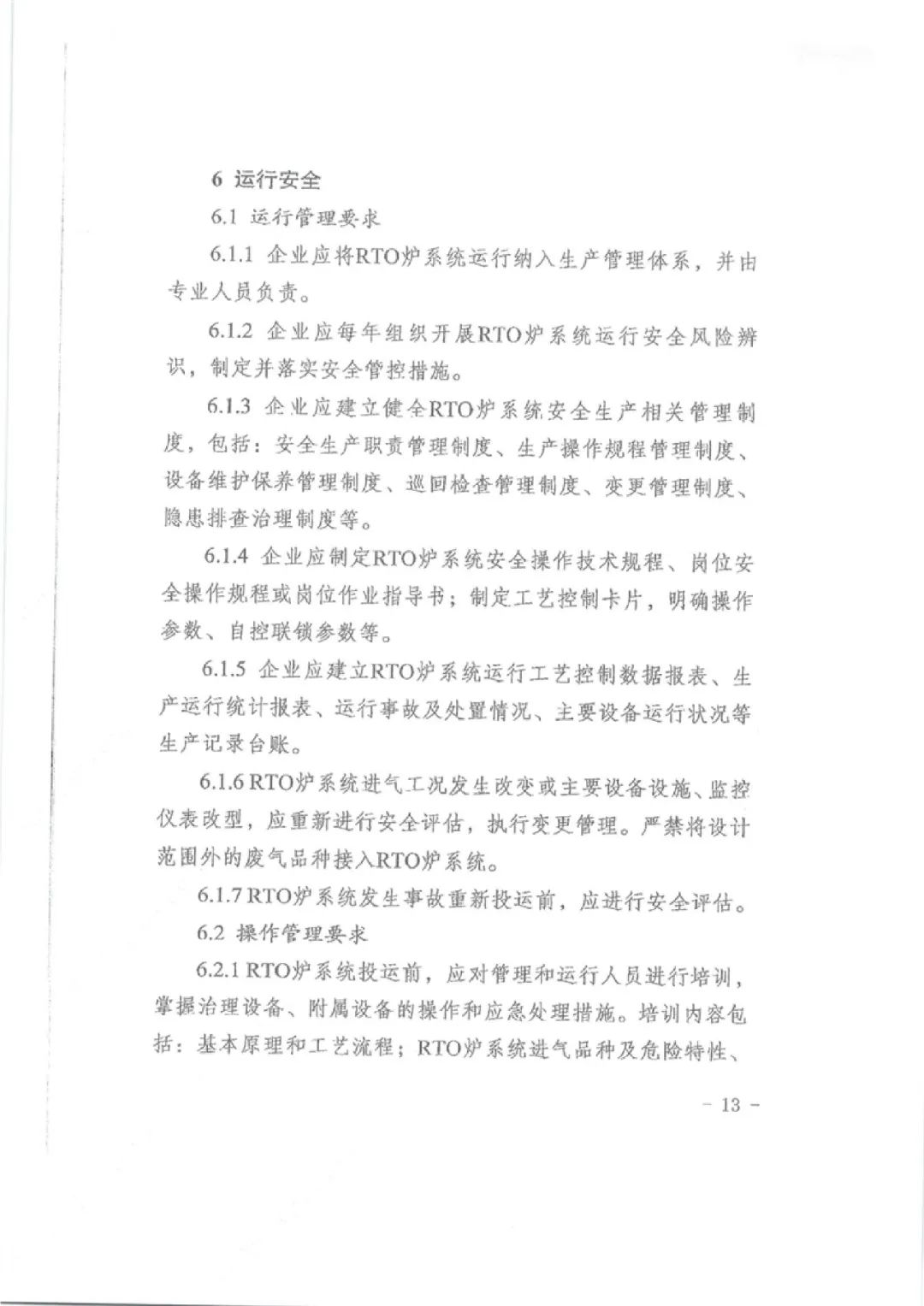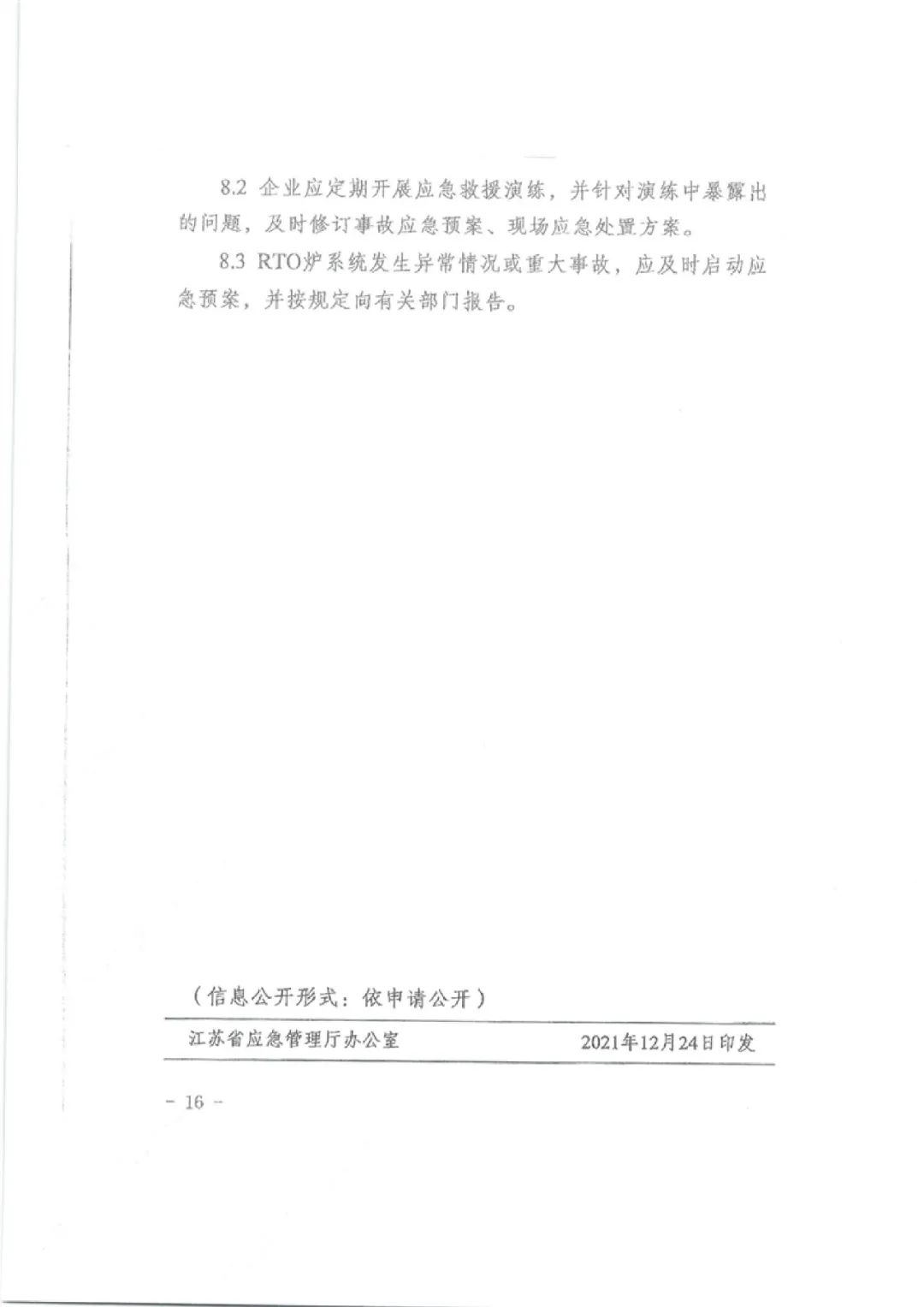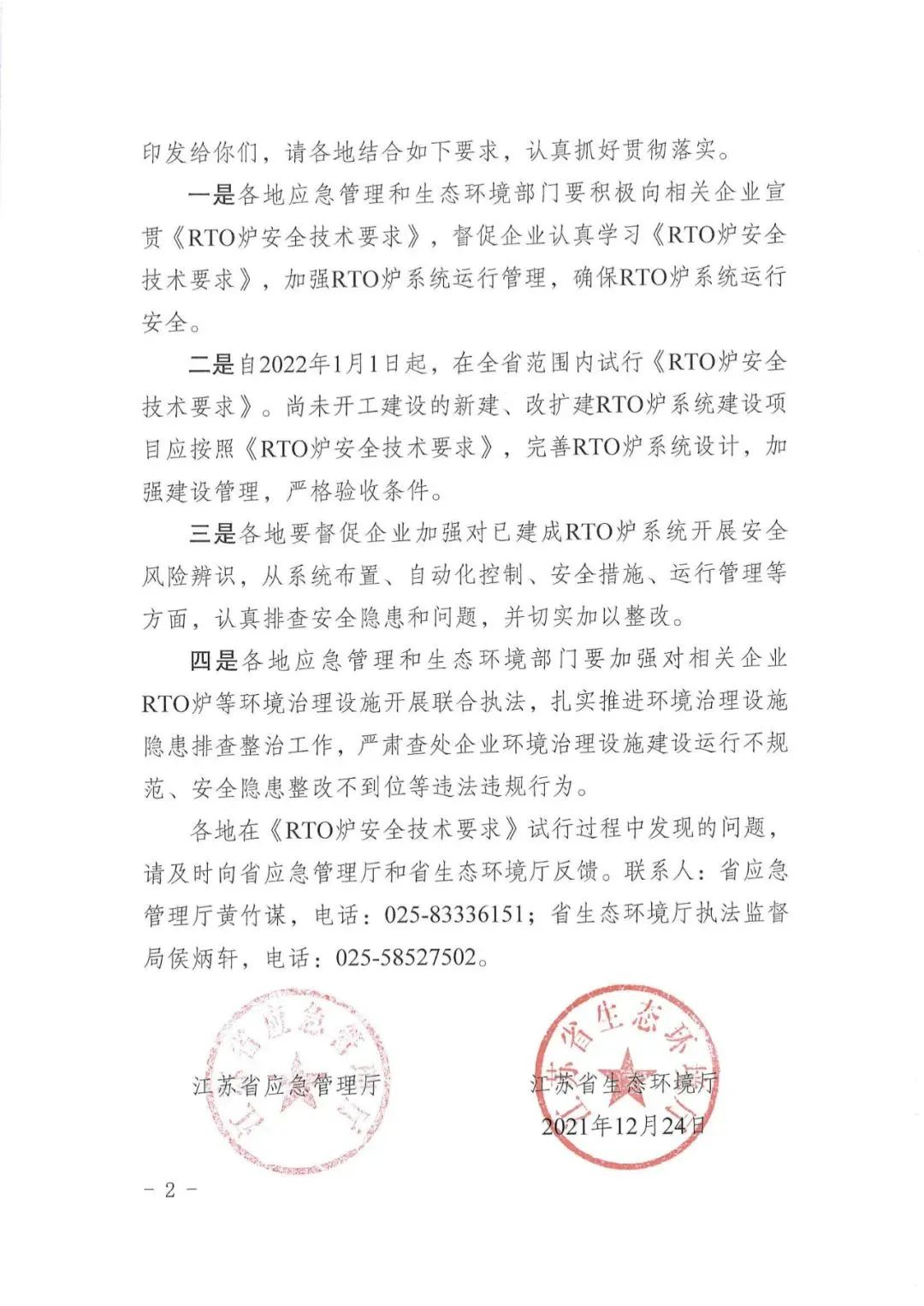 为深刻汲取事故教训,进一步规范企业RTO炉系统建设,指导使用企业科学安全建设、管理和使用RTO炉系统,江苏省应急管理厅、生态环境厅联合制定了《蓄热式焚烧炉(RTO炉)系统安全技术要求(试行)》(简称《RTO炉安全技术要求》),同时于2022年1月1日在全省范围内试行。全文如下: