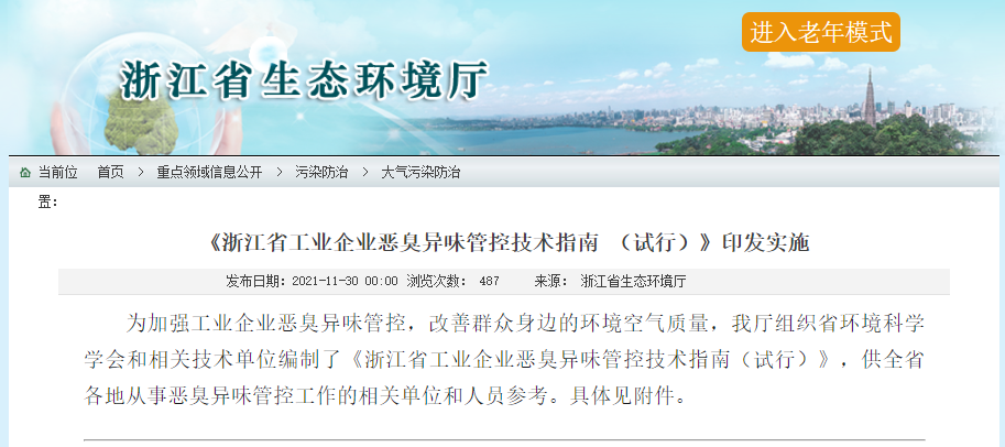 为加强工业企业恶臭异味管控,改善群众身边的环境空气质量,近日,浙江省生态环境厅组织省环境科学学会和相关技术单位编制了《浙江省工业企业恶臭异味管控技术指南(试行)》。