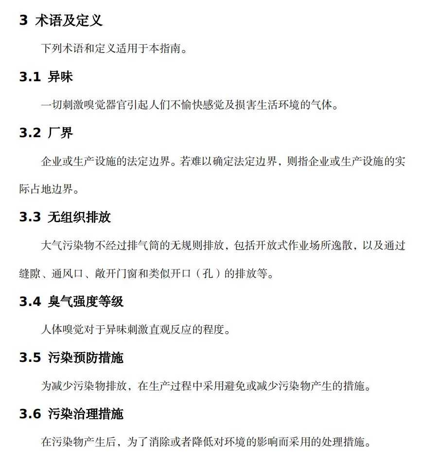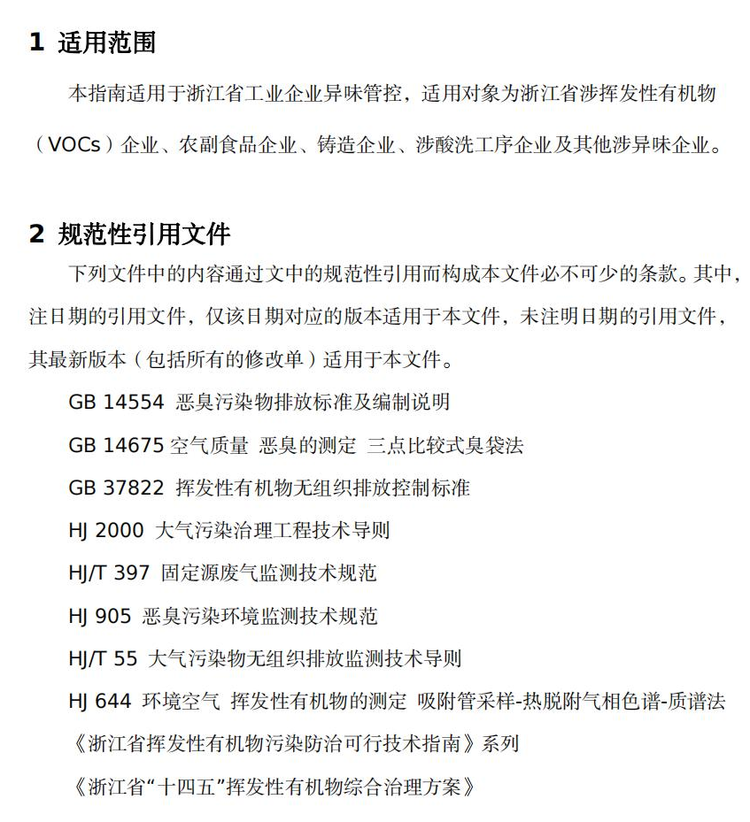 本指南适用于浙江省工业企业异味管控,适用对象为浙江省涉挥发性有机物 (VOCs)企业、农副食品企业、铸造企业、涉酸洗工序企业及其他涉异味企业。