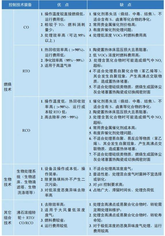 实用的VOCs末端治理技术众多,主要包括吸附、燃烧(高温焚烧和催化燃烧)、吸收、冷凝、生物处理及其组合技术。表 3-1列出了主要控制技术的优缺点。