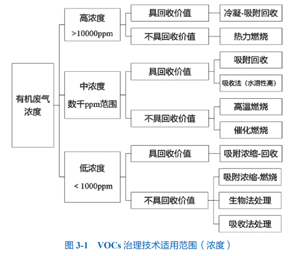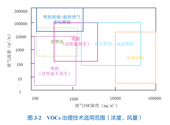 图 3-2 直观地给出了不同单元治理技术所适用的有机物浓度和废气流量的大致范围。对于废气流量,图中给出的是单套处理设备最大处理能力和比较经济的流量范围。当废气流量较大时,可以采用多套设备分开进行处理。由图可知,吸附浓缩 + 脱附排气高温焚烧/催化燃烧组合技术适用于大风量低浓度VOCs废气的治理;生物法适用于中等风量较低浓度VOCs废气的治理;吸附法(更换活性炭)适用于小风量低浓度VOCs废气的治理;活性炭/活性炭纤维吸附溶剂回收适用于中大风量中低浓度VOCs废气的治理;催化燃烧法、高温燃烧治理技术适用于中小风量中高 浓度VOCs废气的治理;冷凝回收法适用于中低风量高浓度VOCs废气的 治理。高浓度的VOCs废气一般都不能只靠单一的技术来进行治理,一般都是利用组合技术来进行一个有效的治理,如采用冷凝回收+活性炭纤维吸附回收技术等