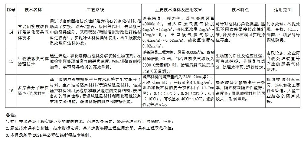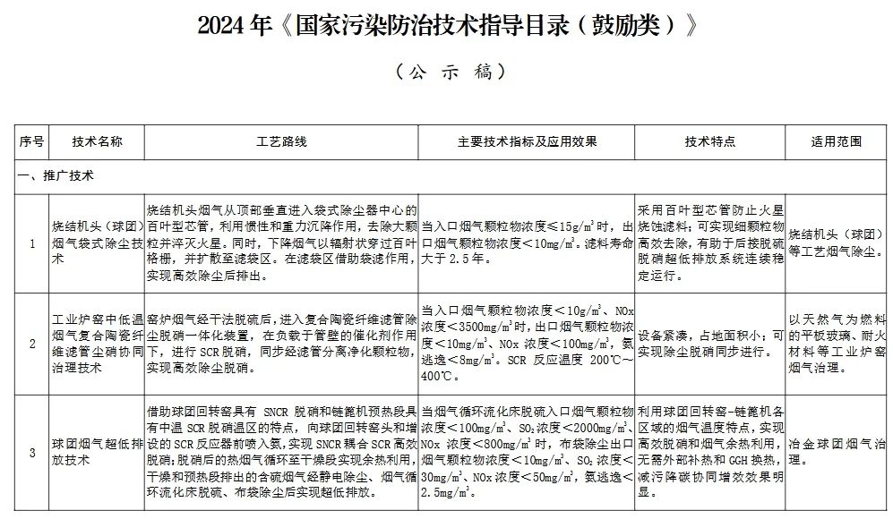 12月26日,生态环境部发布《2024年《国家污染防治技术指导目录(鼓励类)》(公示稿)》。共涉及16项技术,其中推广技术6项,示范技术10项。与征求意见稿19项相比,公示稿19项减少了3项,分别为:微克级工业烟尘过滤材料和装备(示范技术)、水泥窑烟气催化复合脱硫技术(推广技术)和等离子体耦合喷淋洗涤恶臭治理技术(示范技术)。