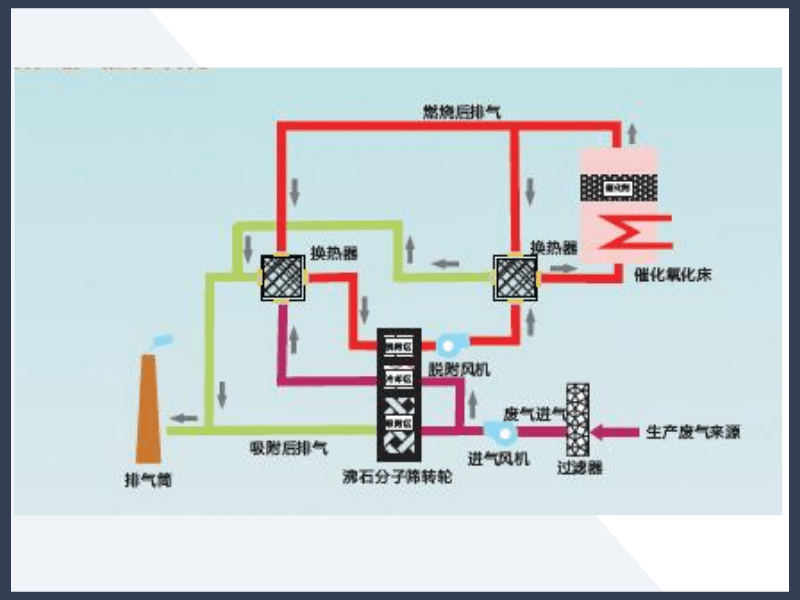 说明:此工艺适合中、小风量、低浓度、低温度、低湿度、低粘度挥发性有机废气,对于高温、高湿度、高粘性的挥发性有机废气,需要进行预处理后再进入吸附浓缩装置。