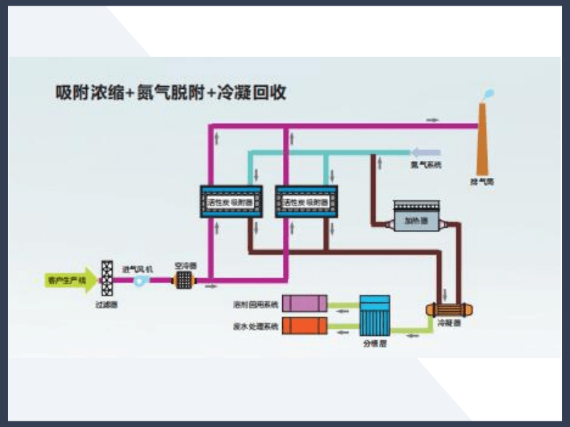 说明:此工艺适合中小风量、高浓度,成分单一,有回收价值的挥发性有机废气;采用此工艺要求企业有氮气来源,对于无蒸汽源企业可以采用氮气发生器。