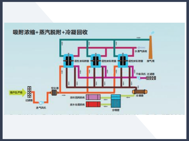 说明:此工艺适合中小风量、高浓度,成分单一,有回收价值的挥发性有机废气;采用此工艺要求企业有蒸汽来源,对于无蒸汽源企业可以采用氮气脱附。