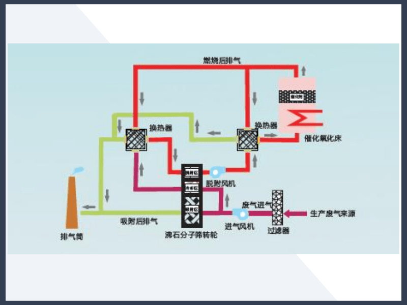 说明:此工艺适合中、小风量、低浓度、低温度、低湿度、低粘性挥发性有机废气,对于高温、高湿度、高粘性的挥发性有机废气,需要进行预处理后再进入吸附浓缩装置。