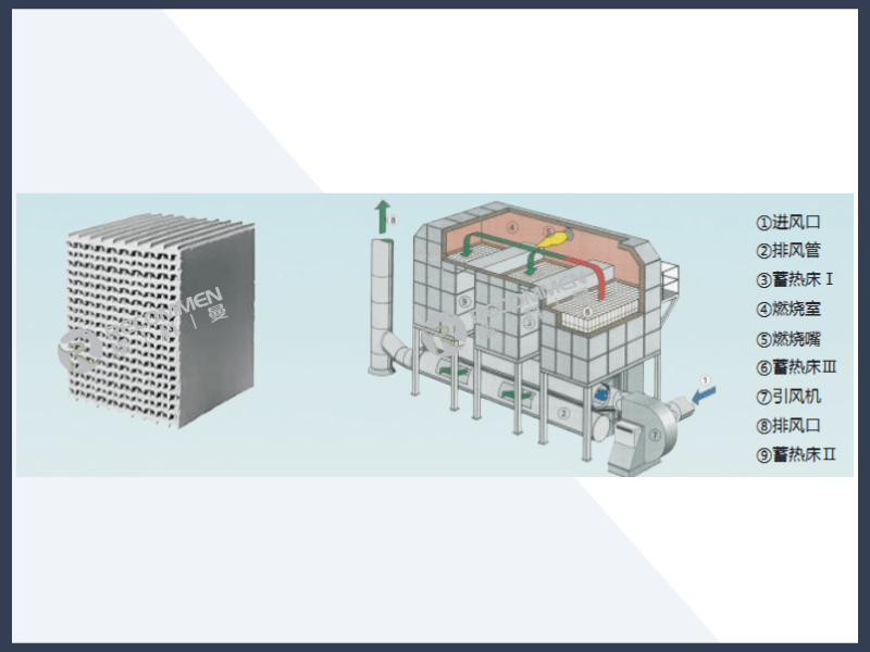 VOCs经过预处理后,进入第一个蓄热室,通过辅助燃烧至反应所需温度,发生高温氧化反应;氧化后的高温气体进入第二个蓄热室,使蓄热体蓄升蓄热,气体经过换热降温后排至大气。间隔一定时间后,VOCs进入第二个蓄热室预热,通过辅助燃烧至反应所需温度,发生高温氧化反应,氧化后的高温气体进入第一个蓄热室/反应室换热,使蓄热体蓄热,气体经过换热降温后排至大气。第三个蓄热室作为备用反吹,以提高蓄热效率,依次循环。