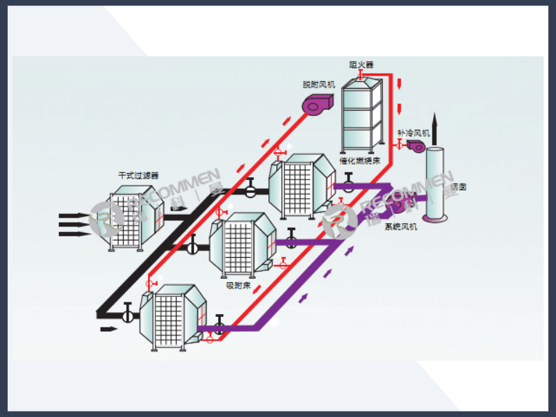 固定床吸附浓缩+催化燃烧工艺流程图