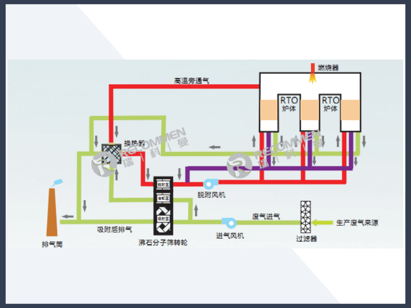 此工艺适合中、大风量、低浓度、低温度、低湿度、低粘性挥发性有机废气,对于高温、高湿度、高粘性的挥发性有机废气,需要进行降温、除湿、除尘、除油等预处理后再进入吸附浓缩装置(沸石转轮/活性炭吸附)。通常中等风量采用盘式转轮吸附浓缩(对于生产连续性要求不高场合,考虑其经济性,可采用活性炭吸附浓缩);大风量可采用旋转式转轮浓缩。